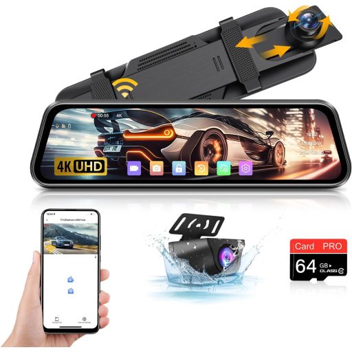 4K WiFi Tolatókamera Tükör - 10" IPS Érintőképernyős Menetrögzítő Kamera Első-Hátsó Kamerával, 64GB SD Kártyával, Parkolási Asszisztenssel,