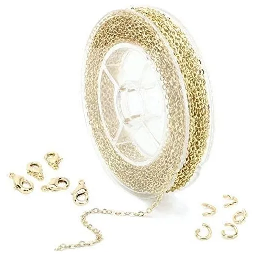 • Teljes csomag: 10 méter aranyított kábellánc + 50 nyitott karika (4 mm átmérő) + 20 homár kapcsi (9 mm hosszú)