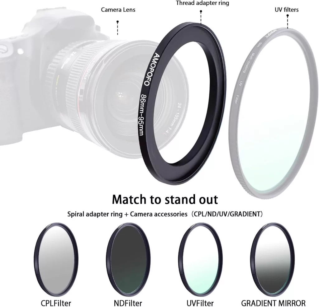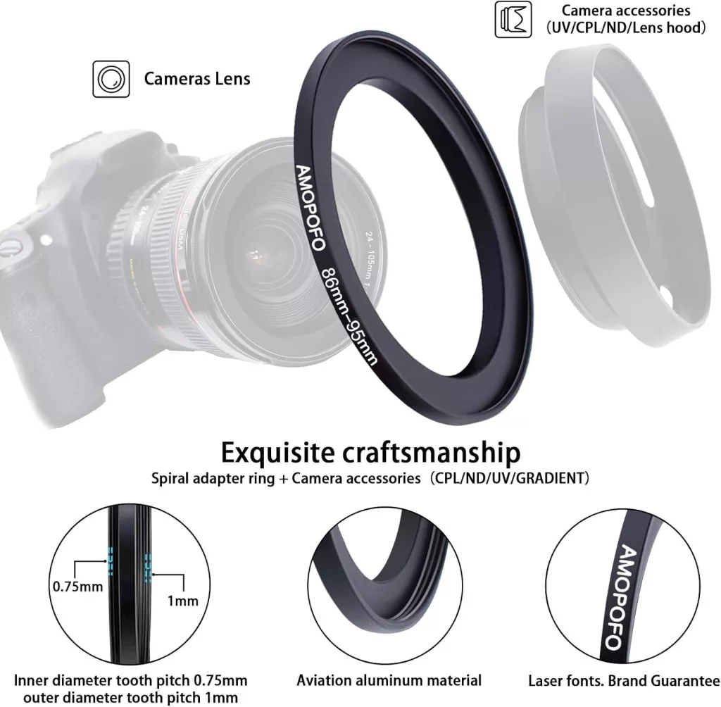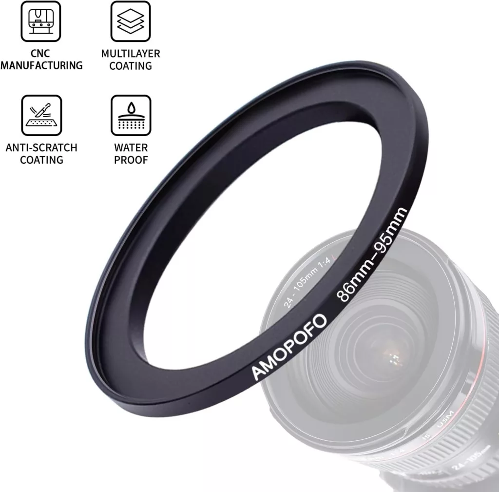 Ez a kiváló minőségű lencseadapter lehetővé teszi, hogy a 86 mm-es kameralencséhez 95 mm-es szűrőket és kiegészítőket csatlakoztass. Az adapter egyszerűen csavarodva felszerelhető a lencse elején, és biztonságos, szoros illeszkedést biztosít anélkül, hogy keresztmenetezés vagy billegés lenne. Ideális megoldás azoknak, akik szeretnék maximálisan kihasználni kamerakiegészítőiket.