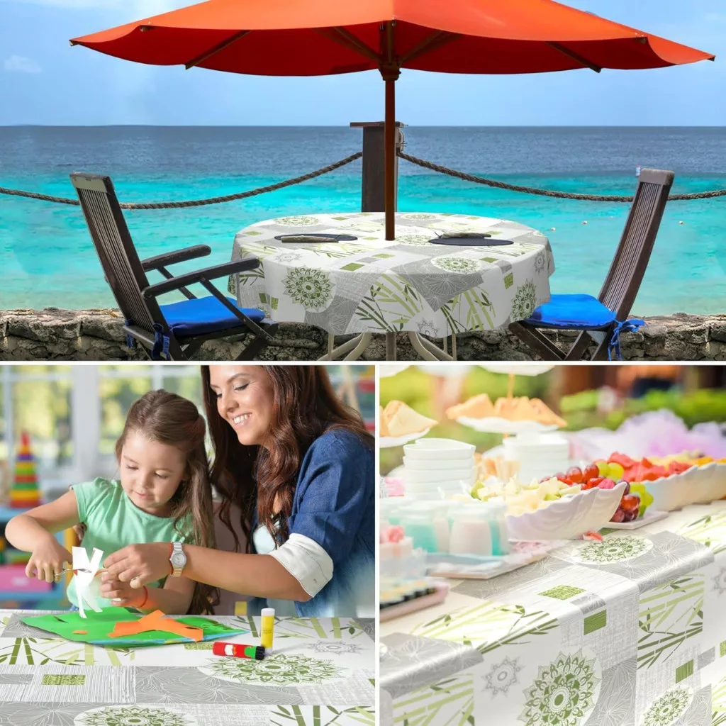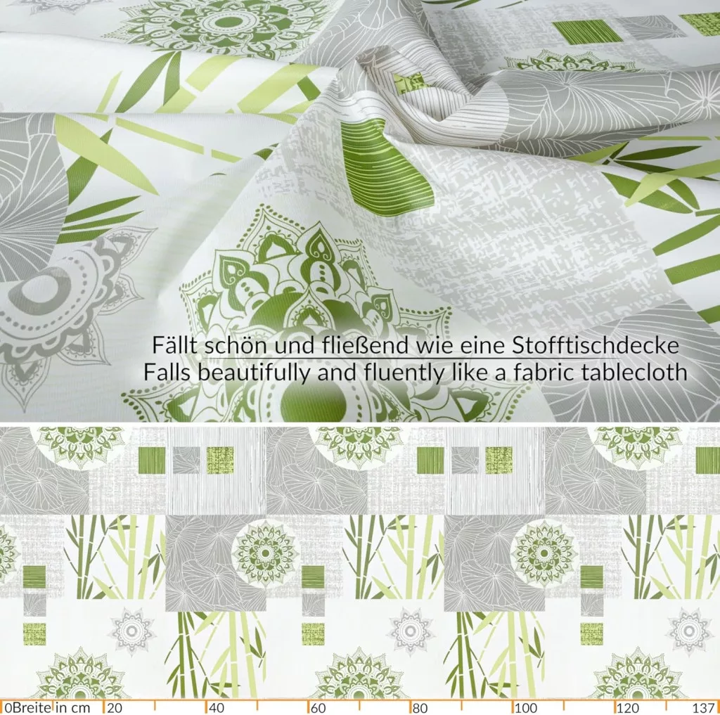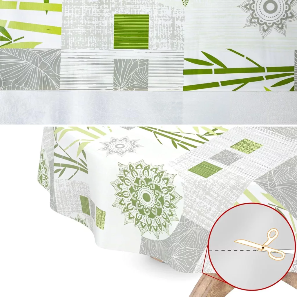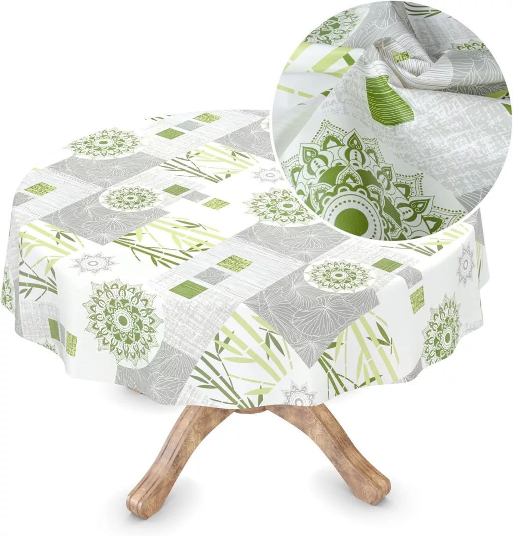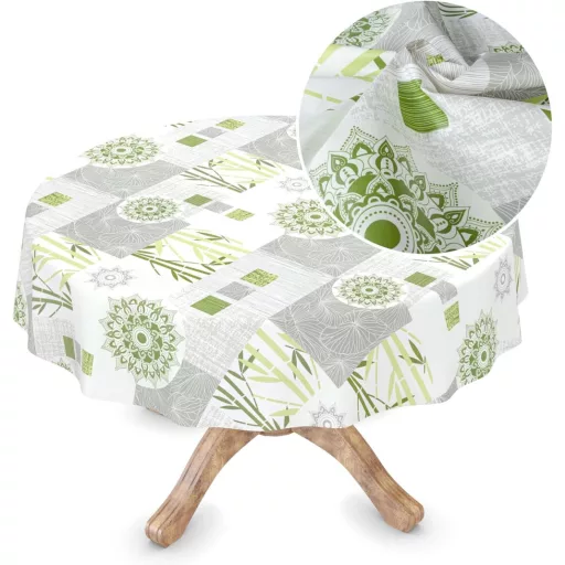 Az INES viaszos terítő egy modern, sokoldalú megoldás az otthon és a kert számára. A bambusz ágak és mandala virágok mintája frissességet és elegáns stílust hoz az asztalra. Ez a 135 cm-es kerek terítő tökéletes választás azok számára, akik olyan terítőt keresnek, amely nem csak szép, hanem praktikus és tartós is.