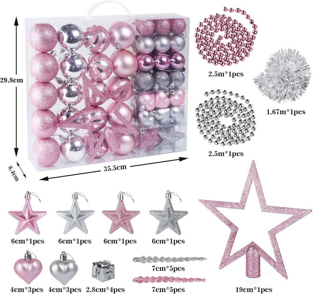 Az Agoer karácsonyi gömb szett egy komplett dekorációs megoldás, amely 60 darabos gyűjteménnyel varázsolja el otthonát az ünnepek alatt. Ez a szett gondosan összeválogatott elemekből áll, amelyek tökéletesen harmonizálnak egymással, és egy mesébe illő karácsonyi hangulatot teremtenek. A rózsaszín és ezüst színkombináció modern és elegáns, amely bármilyen lakberendezéshez illeszkedik.