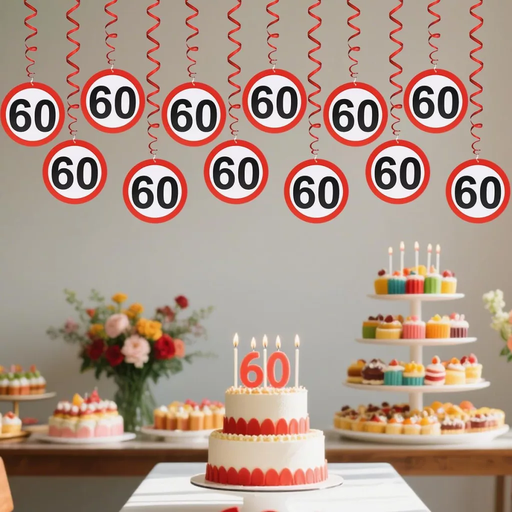 Ez a lenyűgöző dekorációs szett tökéletes választás a 60. születésnap megünnepléséhez. A csomag 12 darab piros spirál garlandot és 12 darab forgalmi jelzés mintájú garlandot tartalmaz, amelyek klasszikus piros-fehér színkombinációban készültek. Az elegáns dizájn és a magas minőségű anyagok garantálják, hogy az ünnepség igazán emlékezetes lesz.
