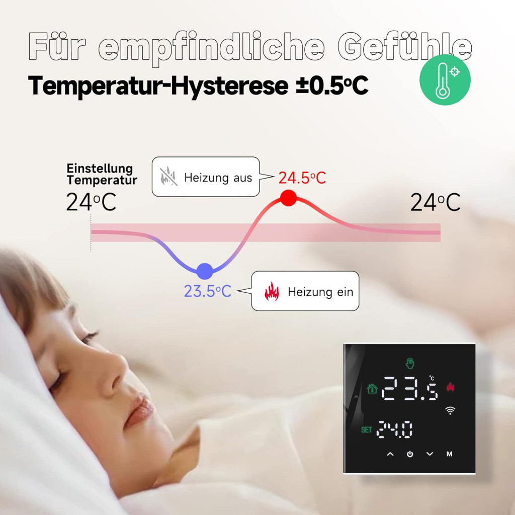 - WiFi kapcsolat és okostelefonos vezérlés - A Tuya alkalmazáson keresztül bárhonnan irányíthatja fűtési rendszerét