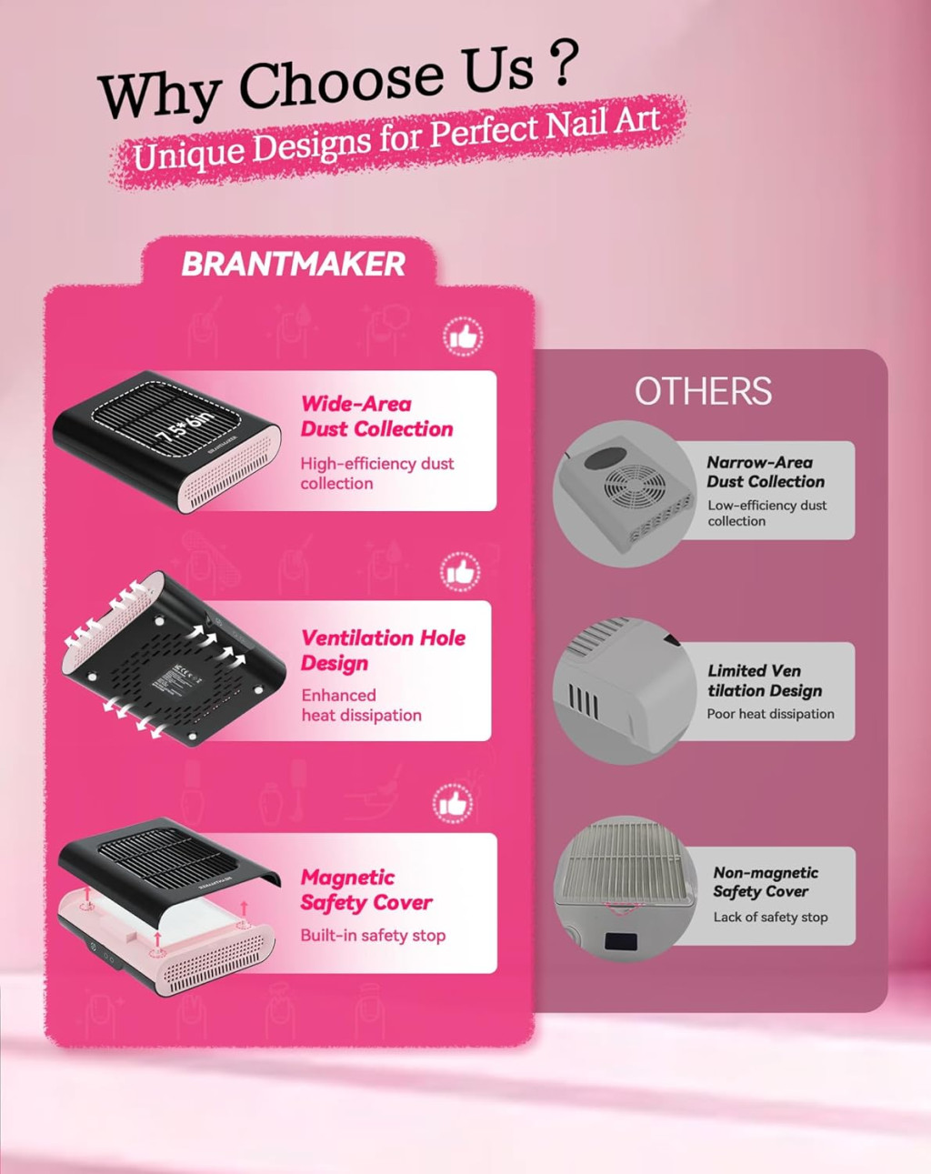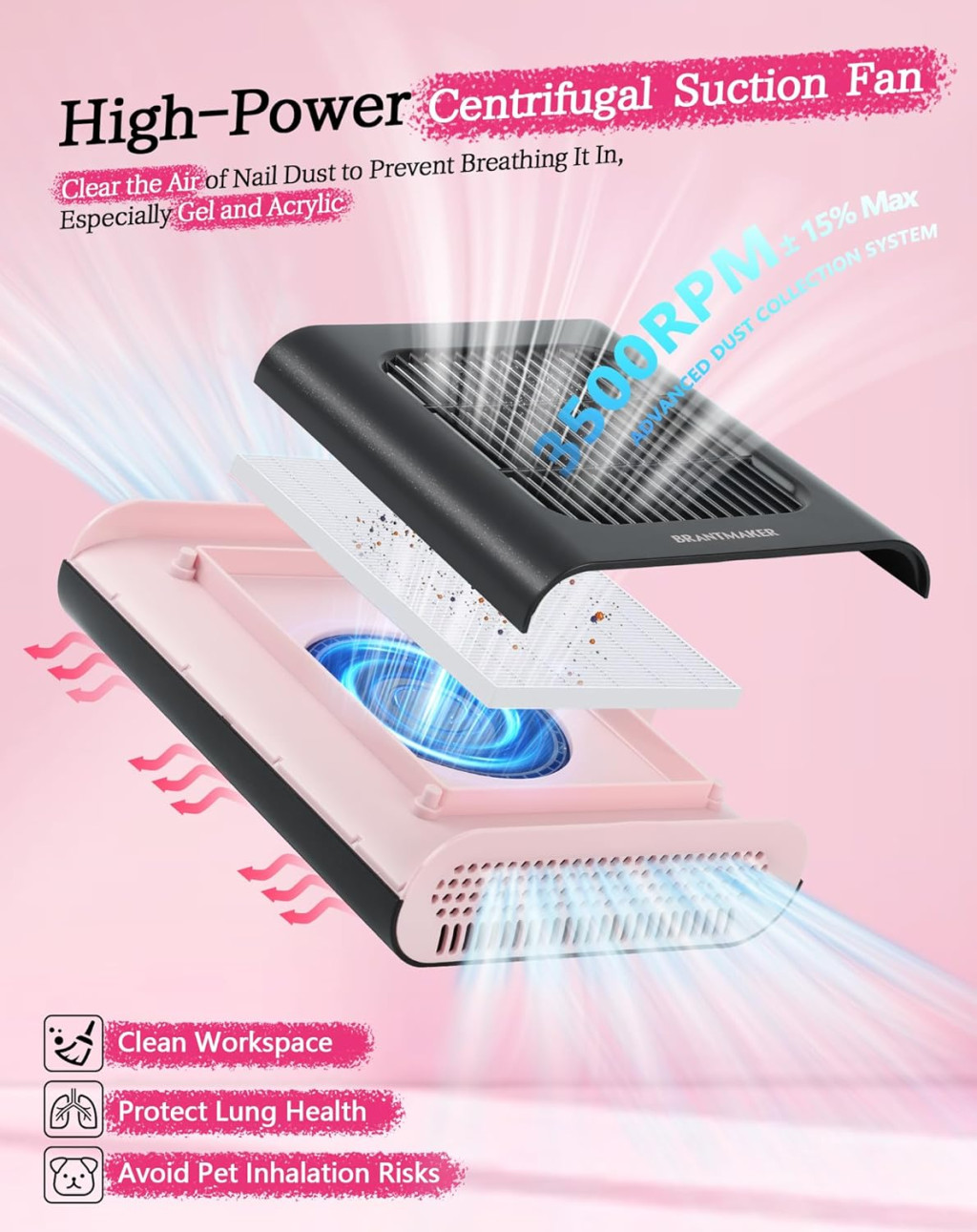 A BRANTMAKER körömpor gyűjtő egy professzionális szalonminőségű eszköz, amely teljesen megváltoztatja a körmös munkavégzés élményét. Ez a modern, elegáns fekete és rózsaszín kialakítású készülék nem csupán egy funkcionális berendezés, hanem a szépségszalon vagy otthoni körmös munkahely igazi ékessége. Az erőteljes centrifugális ventilátor és az intelligens kétüzemmódos rendszer biztosítja, hogy a körömpor és egyéb apró részecskék ne kerüljenek a levegőbe, ezáltal megvédve az egészséget és a munkakörnyezetet.