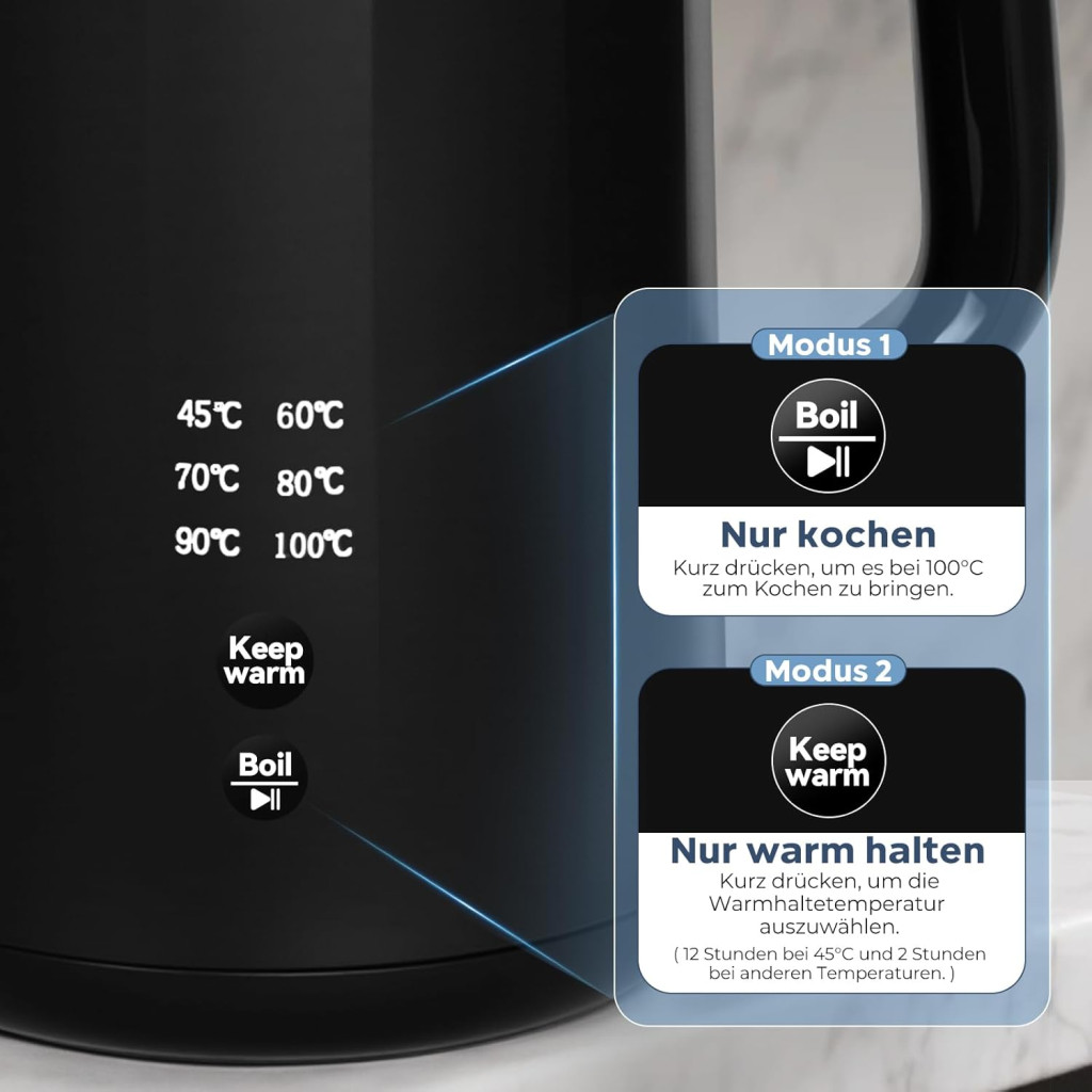 Azonnali forralás 100°C-on, egyéni hőmérséklet-tartás vagy automatikus átmenet a forralásból a kiválasztott hőmérsékletre.