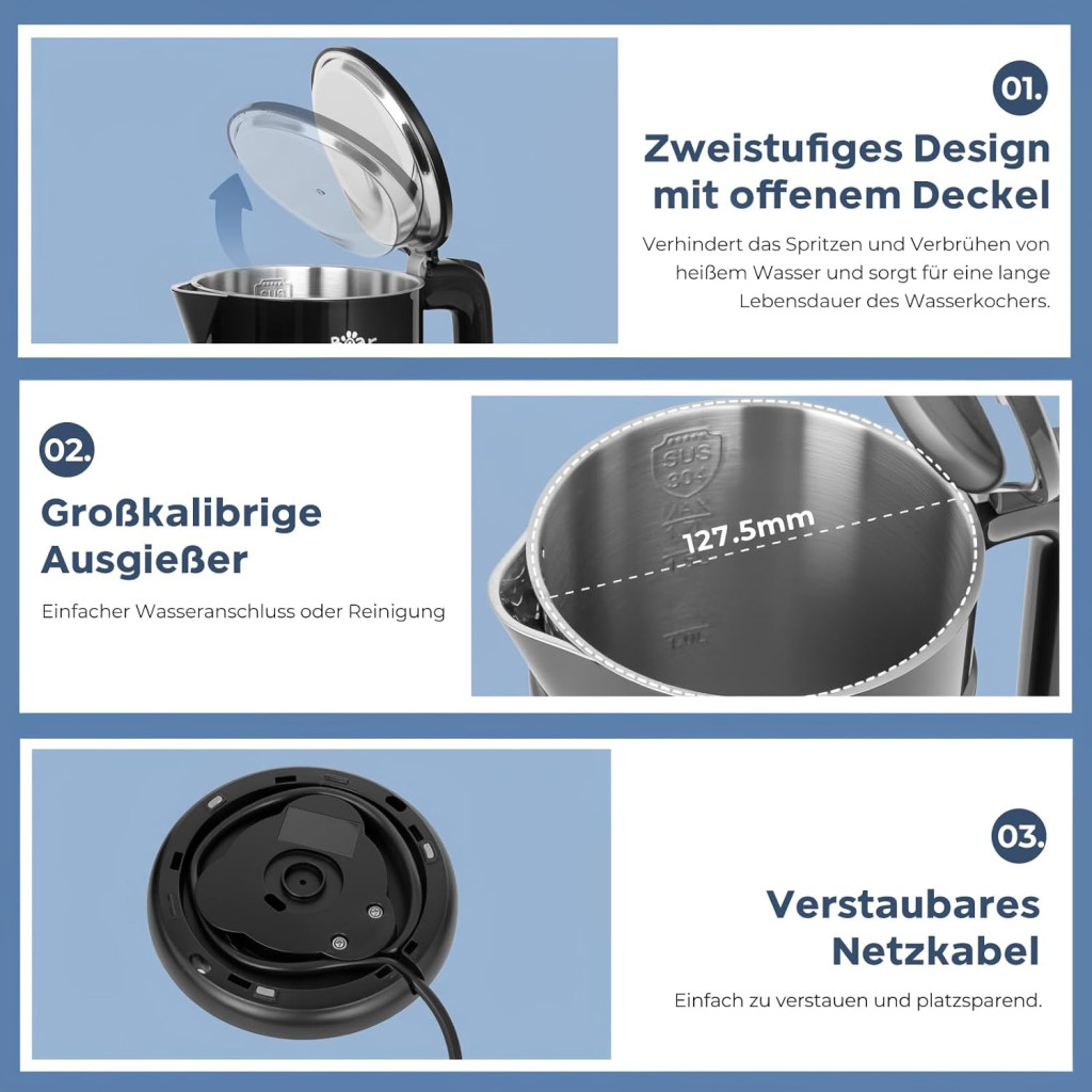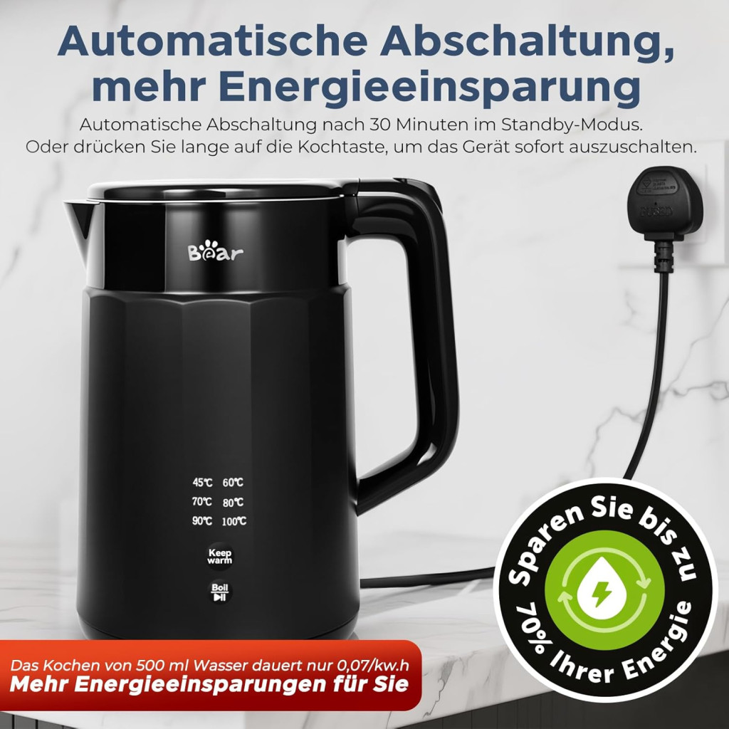 A Bear elektromos vízforraló egy kiváló választás azok számára, akik precíz hőmérséklet-szabályozást és megbízható teljesítményt keresnek. Az 1.7 literes kapacitás, a 6 hőmérséklet-beállítás és a többrétegű biztonsági rendszer ezt a terméket az otthoni és irodai használatra ideális megoldássá teszik. A rozsdamentes acél test és a digitális kijelző prémium minőséget biztosítanak, amely hosszú évekig tarthat. Ha Ön kávé- vagy teakedvelő, vagy egyszerűen csak egy megbízható vízforralót keres, a Bear vízforraló kiváló befektetés.