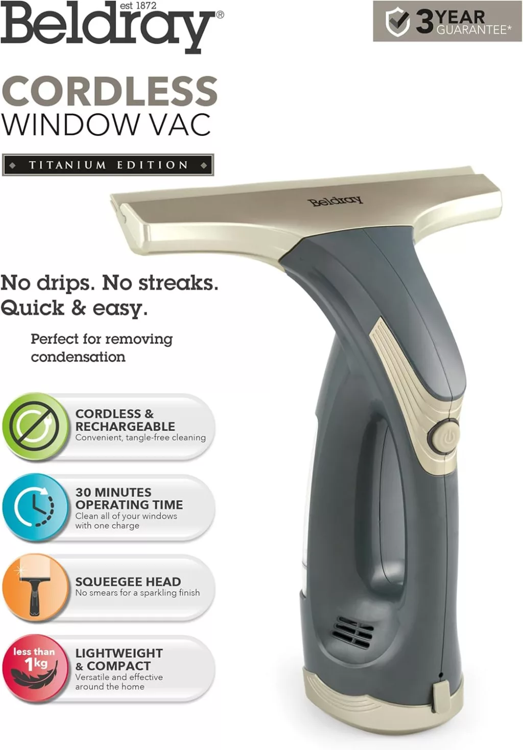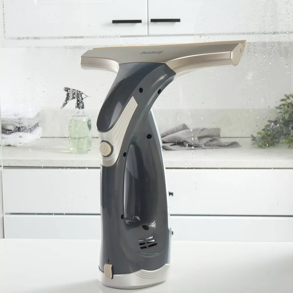 A Beldray Titanium Cordless Window Vacuum Cleaner (modell: BEL0749TTVDE) EU-s csatlakozóval rendelkezik, így közvetlenül használható az európai elektromos hálózatban. Az eszköz gummi és szilikon pengékkel van felszerelve, amely biztosítja a hosszú élettartamot és a hatékony tisztítást.