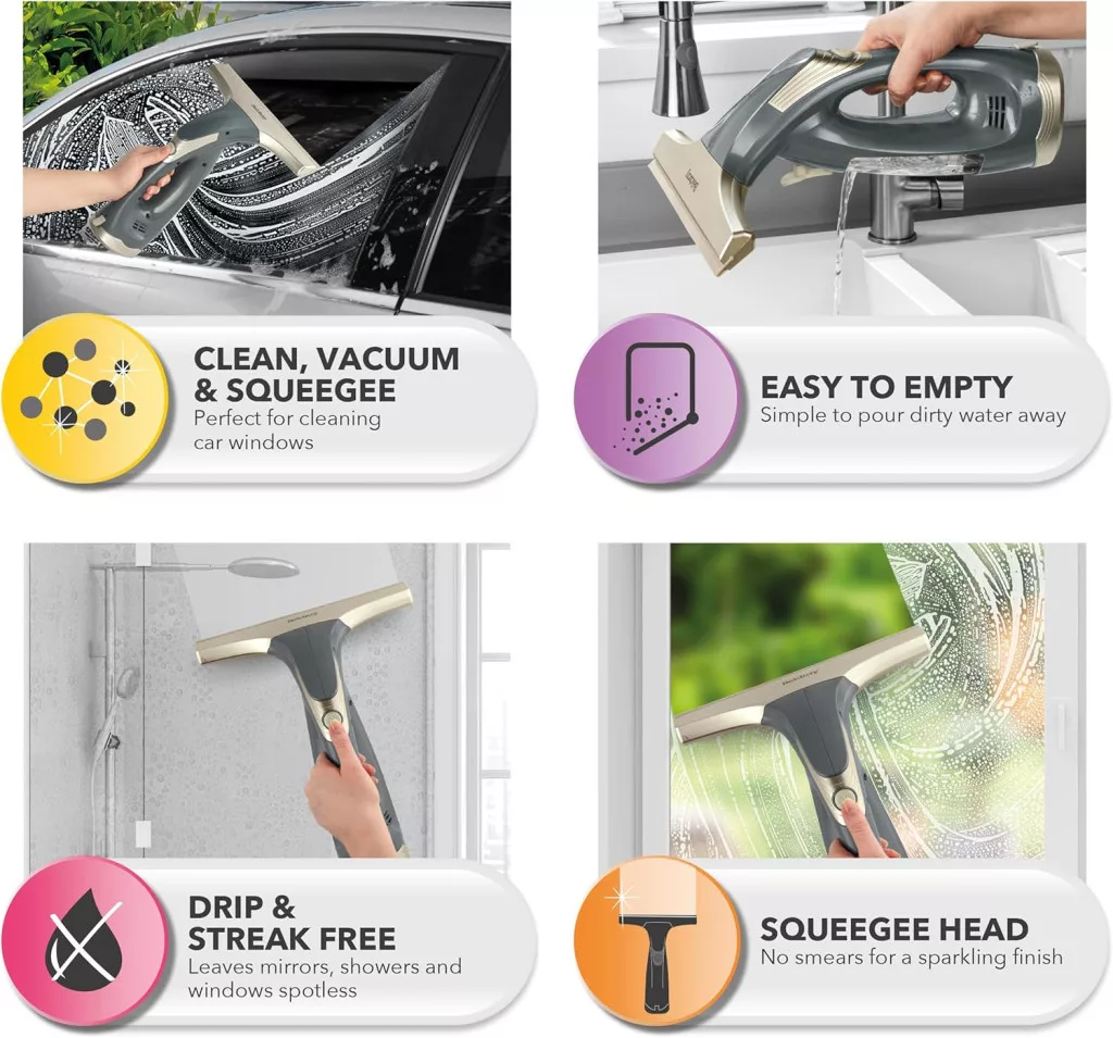 - Cseppmentes és csíkmentes tisztítás: A speciális szívófej eltávolítja a felesleges vizet, így fényes és tiszta ablakokat eredményez