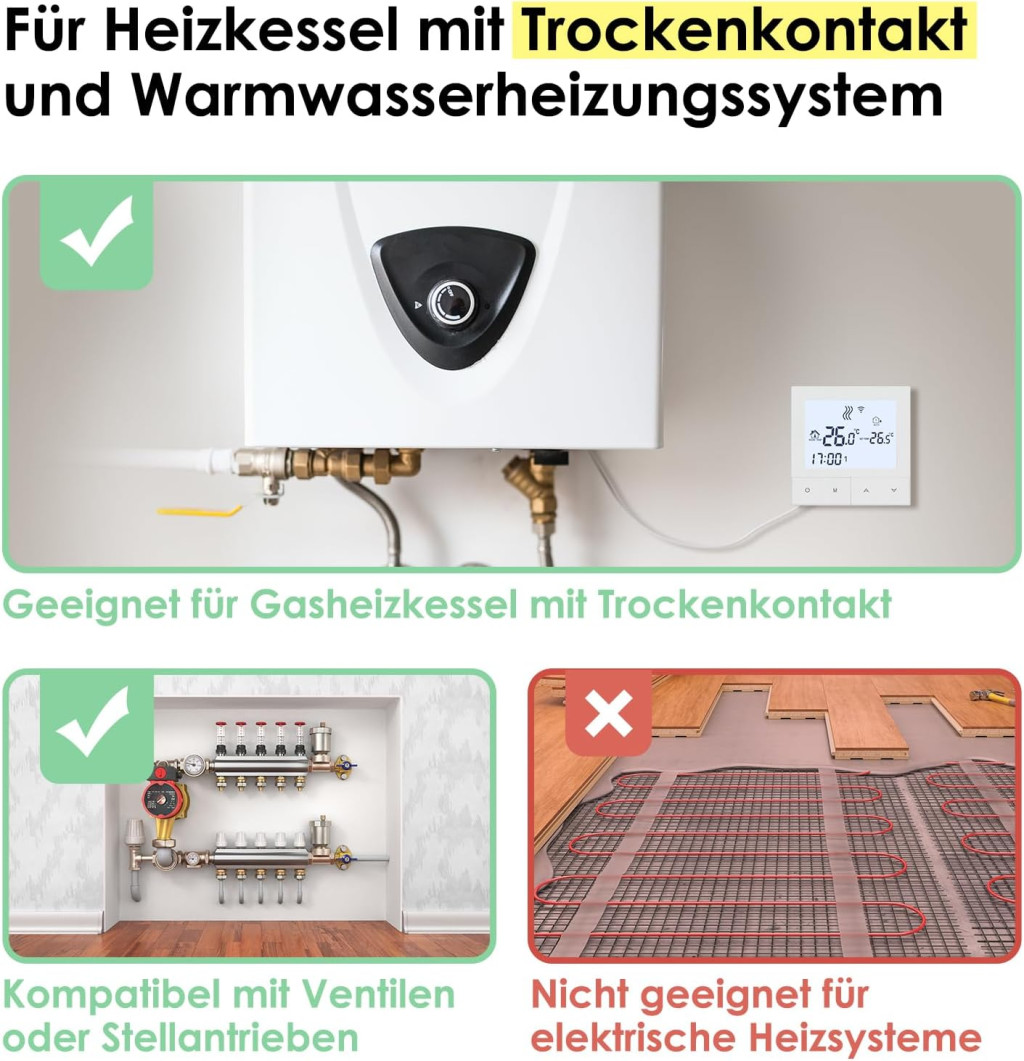 A Beok Smart WiFi termosztát sokoldalúsága révén számos fűtési rendszerrel használható: