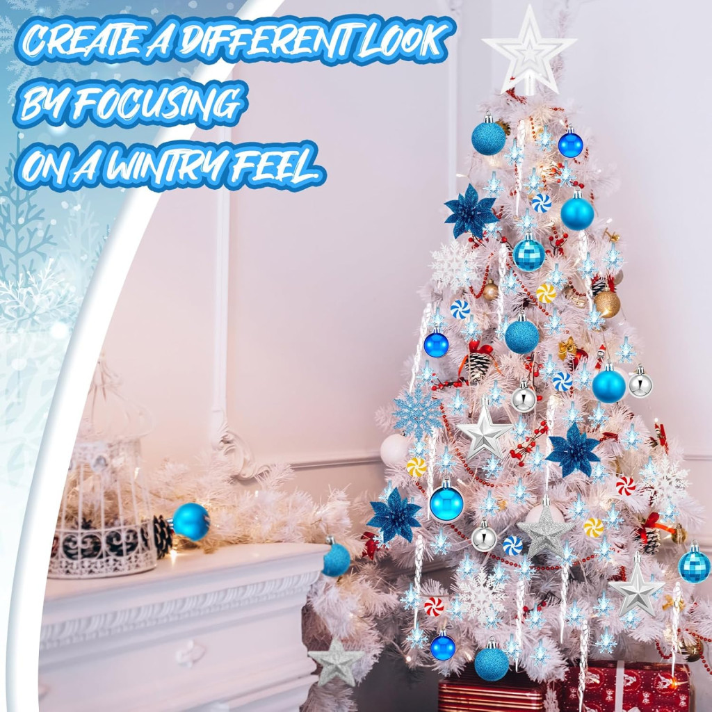 Gazdag Tartalom: A szett 48 karácsonyi gömböt (két stílusban), 6 csillagot, 14 hópehely függőt (8 kék, 6 fehér), 15 cukorka dekorációt (3 szín, 5-5 darab), 12 jégcsapot, 6 virág dekorációt, 1 fa tetőt és 1 LED fényt tartalmaz, amely körülbelül 6,56 méter hosszú. A 30 darab zsinór megkönnyíti a felakasztást és a felszerelést.