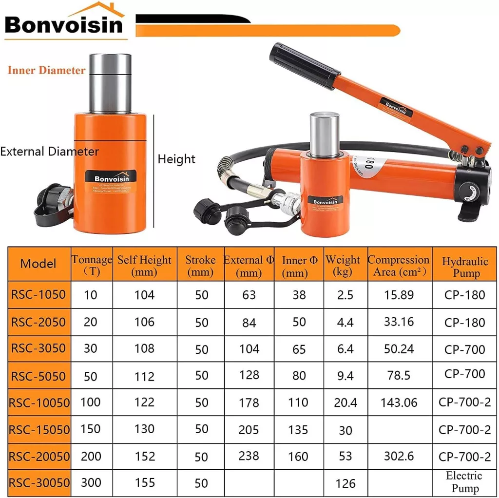 Modell választás: A Bonvoisin hidraulikus hengerek több terhelhetőségi kategóriában érhetők el (10T, 20T, 30T, 50T). A 10T és 20T modellek a CP-180 szivattyúval kompatibilisek, míg a 30T és 50T modellek a CP-700 szivattyút igénylik. Vásárláskor ügyeljen a megfelelő modell kiválasztására.