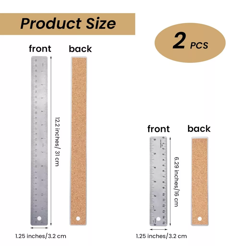 Bremorou Fém Vonalzó Szett 2 db 30cm 15cm Rozsdamentes Acél Vonalzó Dupla Skála Csúszásmentes Parafa Hátlap Iskolai Mérőeszköz