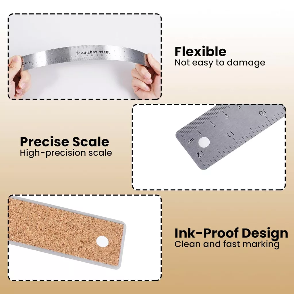 A vonalzók rozsdamentes acélból készültek, amely garantálja a hosszú élettartamot és a precíz méréseket. A lézer gravírozott skálák mind centiméter, mind hüvelyk mértékegységben olvashatók, így univerzálisan használhatók különböző projektekhez. A parafa hátlap nemcsak csúszásmentességet biztosít, hanem megvédi a munkaterületet is a karcolásoktól.