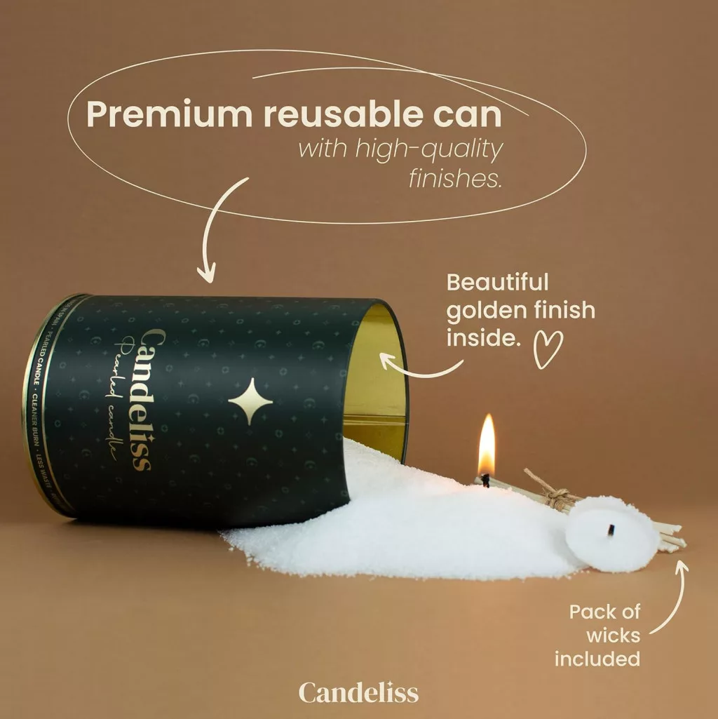 A CANDELISS luxus gyöngy gyertya készlet a tökéletes választás azoknak, akik paraffinmentes, újrafelhasználható és kreatív gyertyamegoldást keresnek. Az elegáns fém dobozban kapott termék tökéletes ajándék vagy saját használatra, és hosszú ideig biztosít tiszta, kellemes fényt otthonodban vagy bármilyen eseményen.