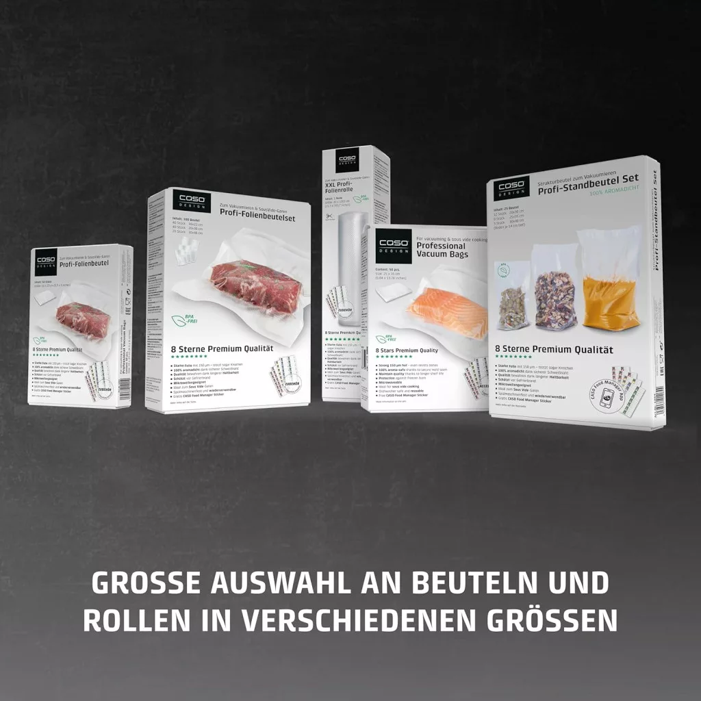 - CASO professzionális fóliazacskók: Különböző méretekben, erős és szakadásálló anyagból, finom bordázott szerkezettel az optimális vákuumozáshoz