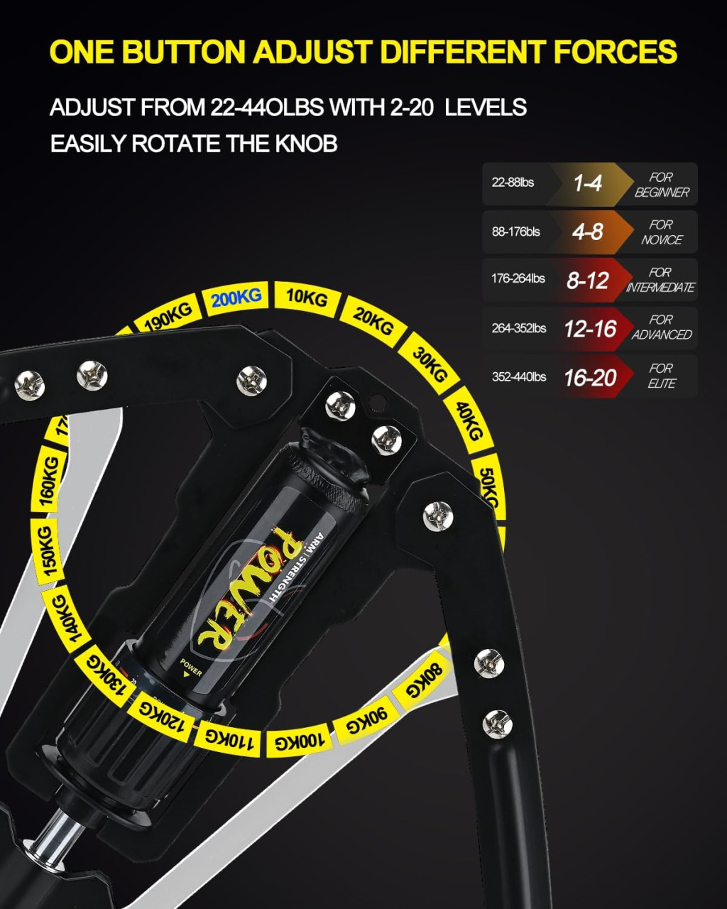 Az Arm Power Twister univerzális edzőeszköz, amely minden fitness szinthez alkalmas. A 10-200 kg közötti terhelési tartomány lehetővé teszi, hogy kezdőktől a haladó edzőkig mindenki megtalálja az ideális intenzitást. Az eszköz kétkezes fogással használható, és a beépített ellenállás-szabályozó gomb segítségével könnyedén állítható az edzés intenzitása.