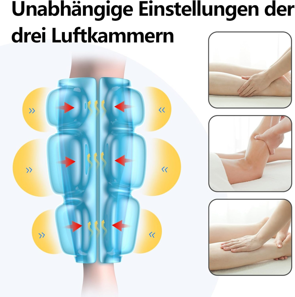 • 360° Légnyomásos Technológia: Három gyűrűs légpárnával ellátott rendszer, amely tökéletesen alkalmazkodik a vádli görbületéhez és egyenletes nyomást biztosít.