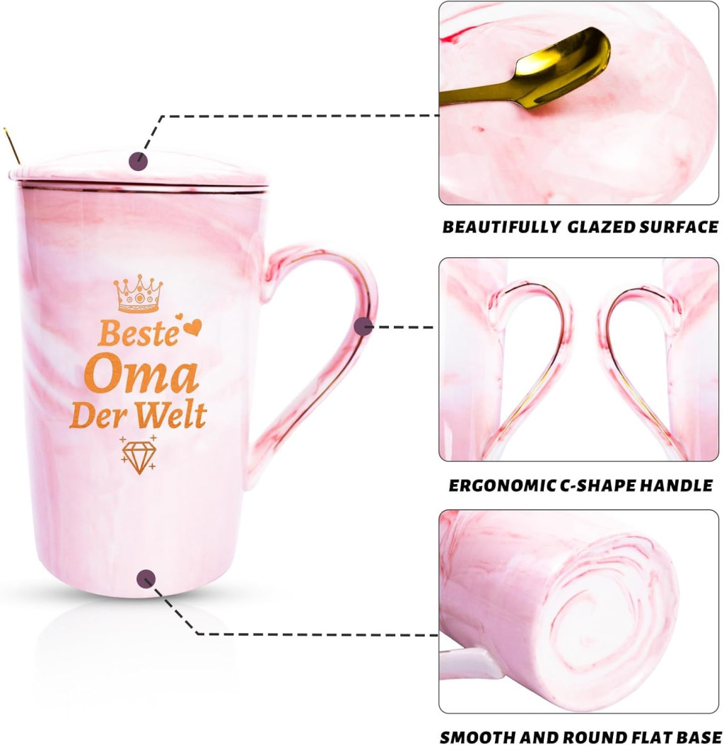DIKARYA Nagymama Bögre 400ml - Rózsaszín Kerámia Kávésbögre Fedéllel és Kanállal - Ajándék Nagymamának Születésnapra, Anyák Napjára