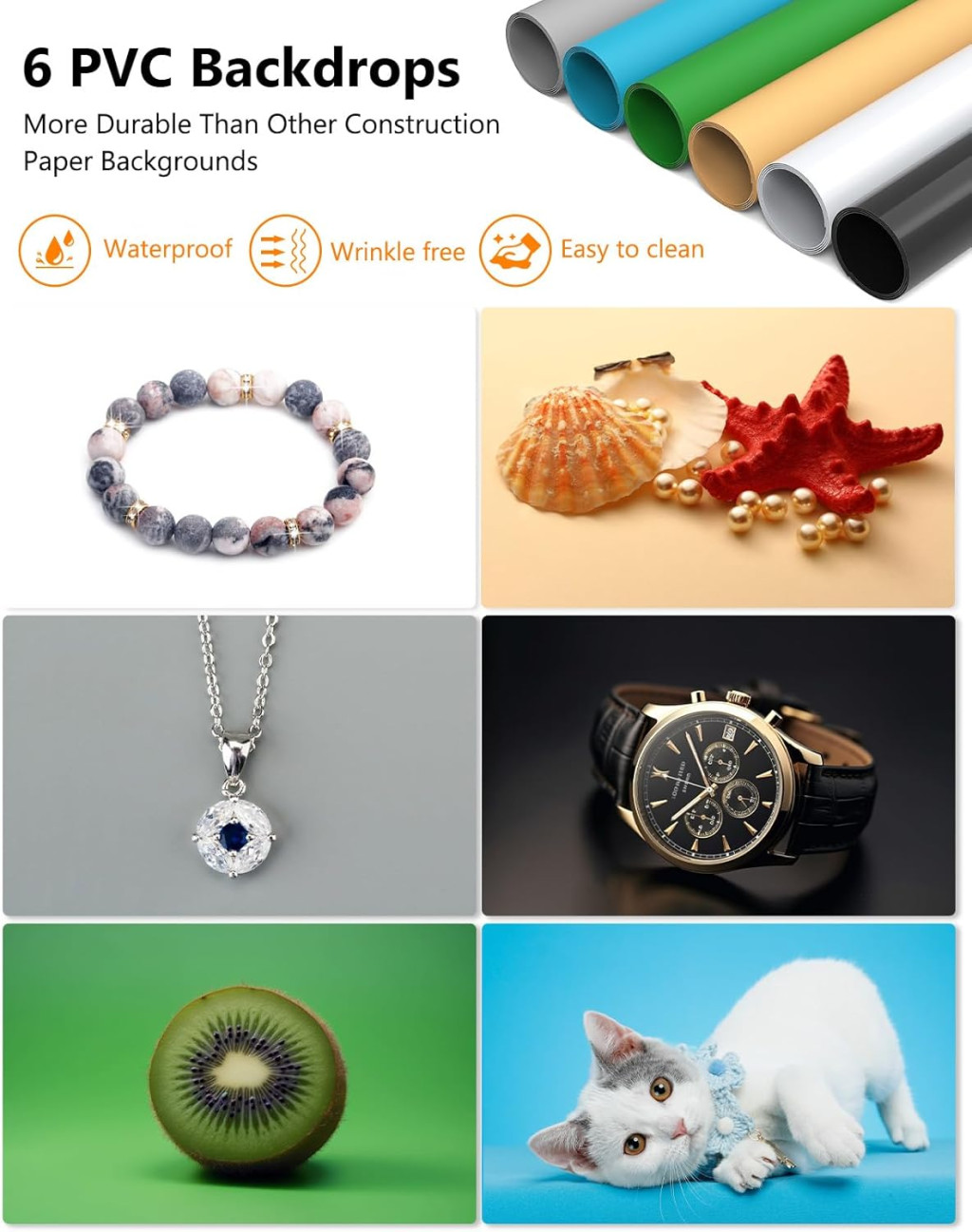 • 6 PVC háttér - Fehér, fekete, szürke, világos narancssárga, kék és zöld