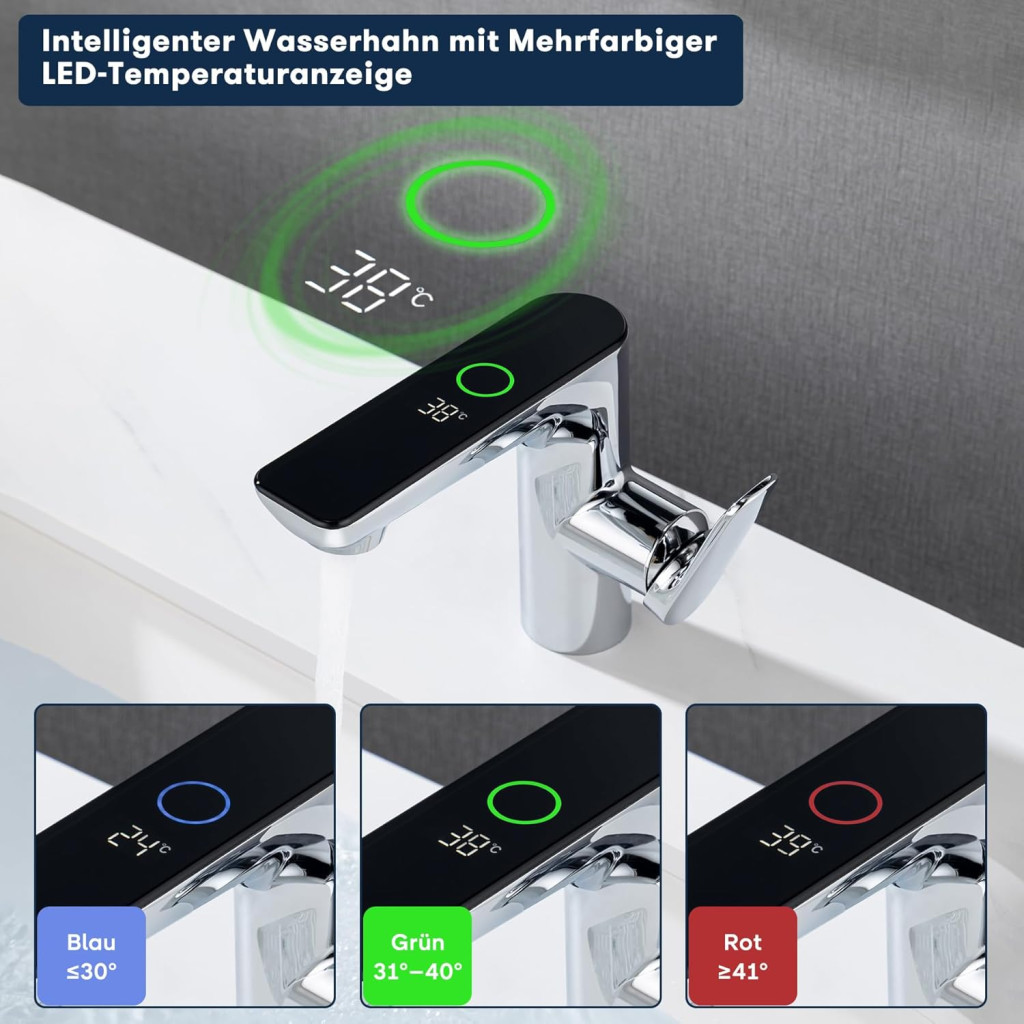 A csaptelep egyedi LED-es hőmérséklet-kijelzésének köszönhetően azonnal láthatja a víz hőmérsékletét. A kék szín ≤31°C-ot, a zöld 32-38°C-ot, a piros pedig ≥39°C-ot jelöl. Ez a funkció megelőzi a véletlenszerű forró vízzel való égési sérüléseket és biztosítja a maximális biztonságot.