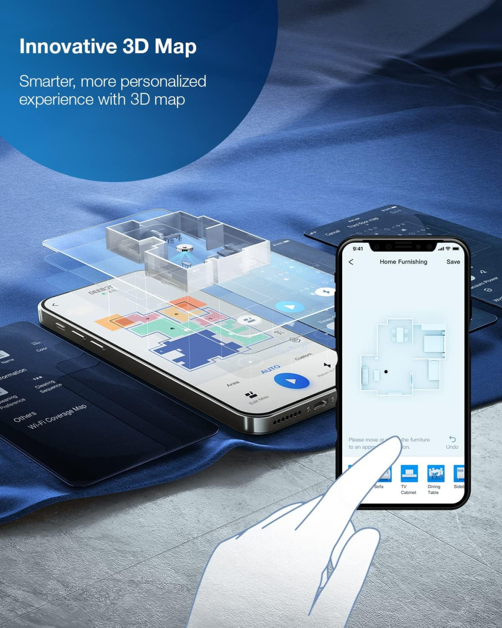 A TrueMapping navigációs rendszer lehetővé teszi, hogy a robot pontosan feltérképezze otthonát, és az alkalmazáson keresztül beállíthatja a takarítási zónákat, virtuális falakat hozhat létre, vagy kijelölhet olyan területeket, amelyeket a robotnak ki kell hagynia. Az új 3D térképmegjelenítés segítségével pedig még intuitívabb módon kezelheti a takarítási beállításokat.