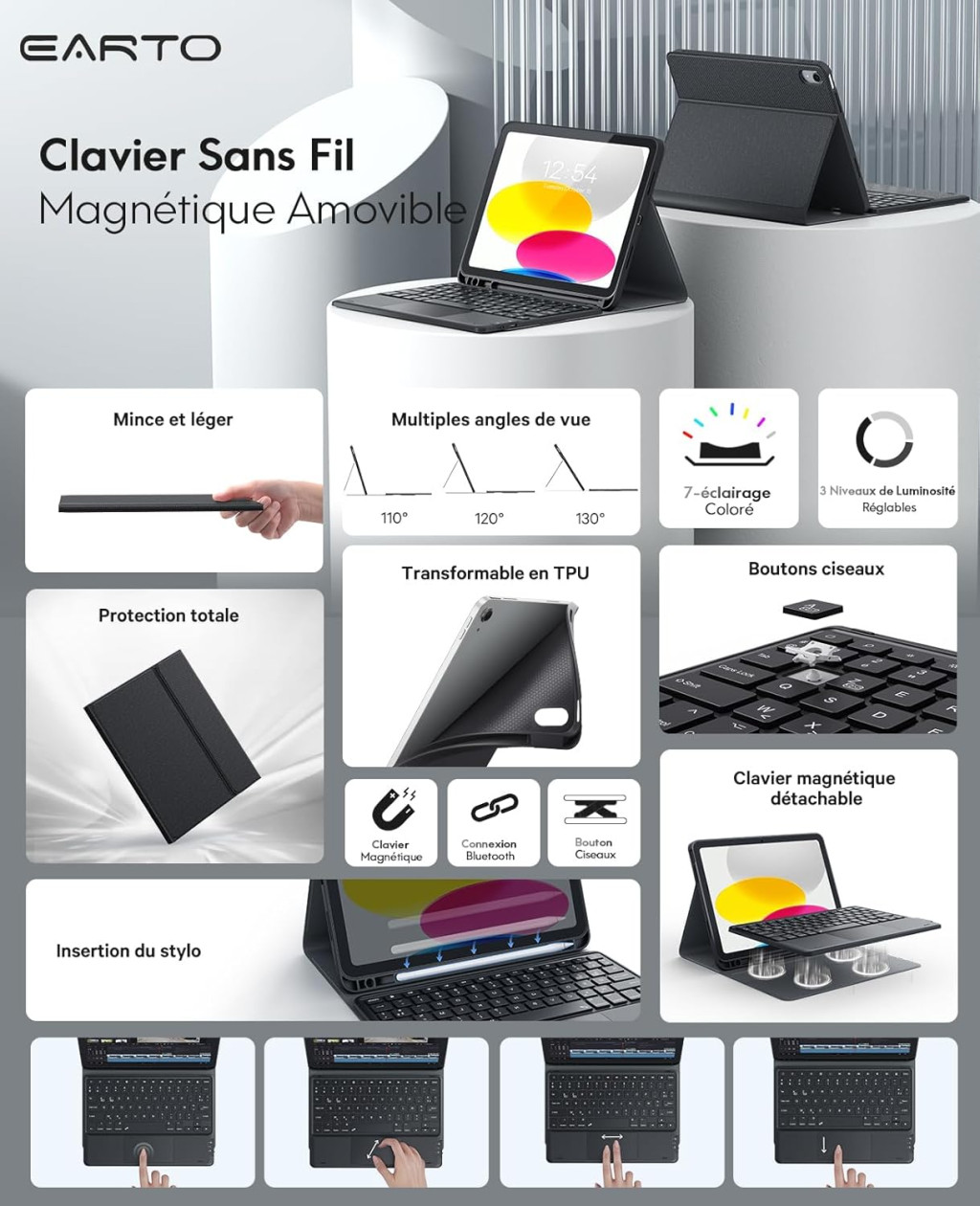 Earto 10. generációs iPad Billentyűzet - Bluetooth, Háttérvilágítás, Trackpad