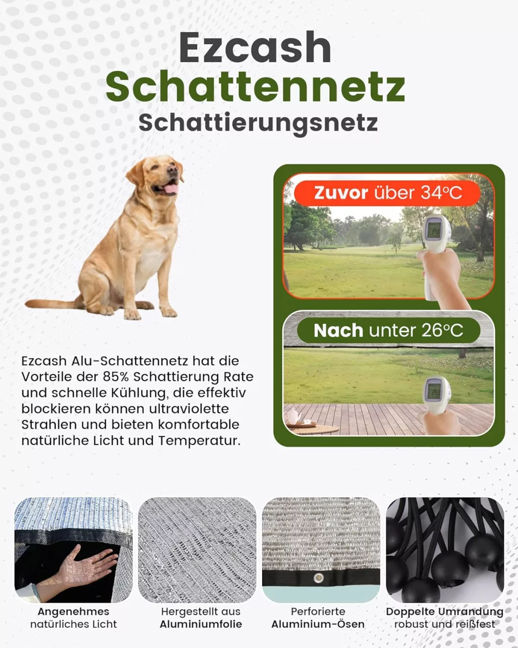 Ezcasch 2x3m Árnyékoló Háló Kutyáknak, 85% Alumínium UV Védelem Kötéllel