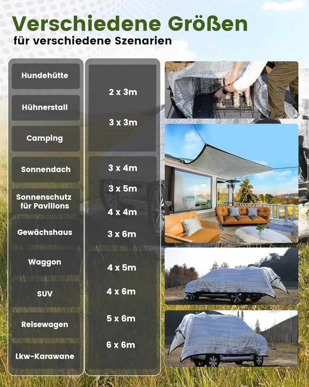 A 2 x 3 méteres méret sokoldalúan alkalmazható, és a teljes kiegészítőkészlet (rugalmas kötél, nylon kötél, szögek) azonnal használatra kész. Az alumínium árnyékoló háló könnyű, hordozható és könnyen tisztítható, így tökéletes választás kültéri tevékenységekhez és utazásokhoz.