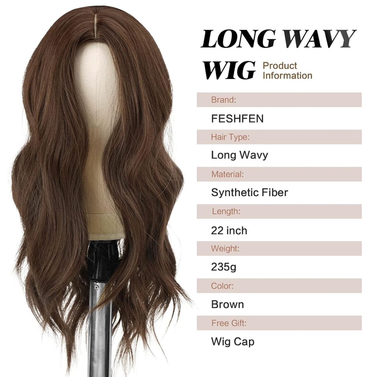 FESHFEN hosszú göndör barna paróka 60cm középválasztékkal női szintetikus hullám