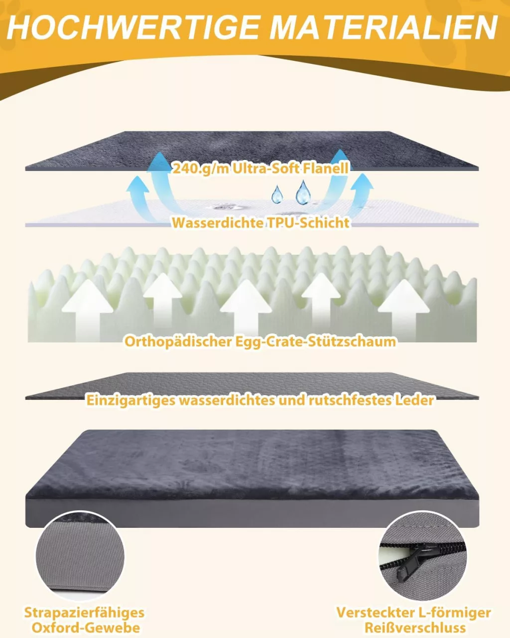 Az ortopédikus kutyaágy prémium anyagokból készült, amelyek hosszú élettartamot biztosítanak. A 25D magas sűrűségű hab rendkívül tartós, és még intenzív napi használat mellett sem lapul össze. Az Oxford szövet szegély karcolásálló és szennyeződésálló, így még az aktív kutyák számára is megfelelő. A vízálló műbőr alapréteg nem csak a nedvesség ellen véd, hanem könnyű tisztántartást is biztosít.