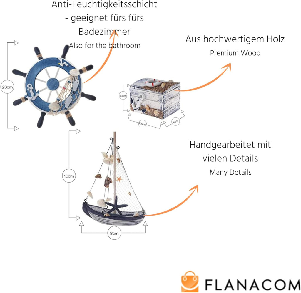 A Flanacom fürdőszobai dekoráció szett egy exkluzív 3 darabos kollekcióból áll, amely a tengerészeti stílus szerelmeseinek tökéletes választása. Minden darab gondosan kézzel készített, részletgazdag fából, amely garantálja a hosszú élettartamot és a kiváló minőséget. Ez a szett nem csupán dekoratív elem, hanem egy teljes tengerészeti világot hoz el otthonába.