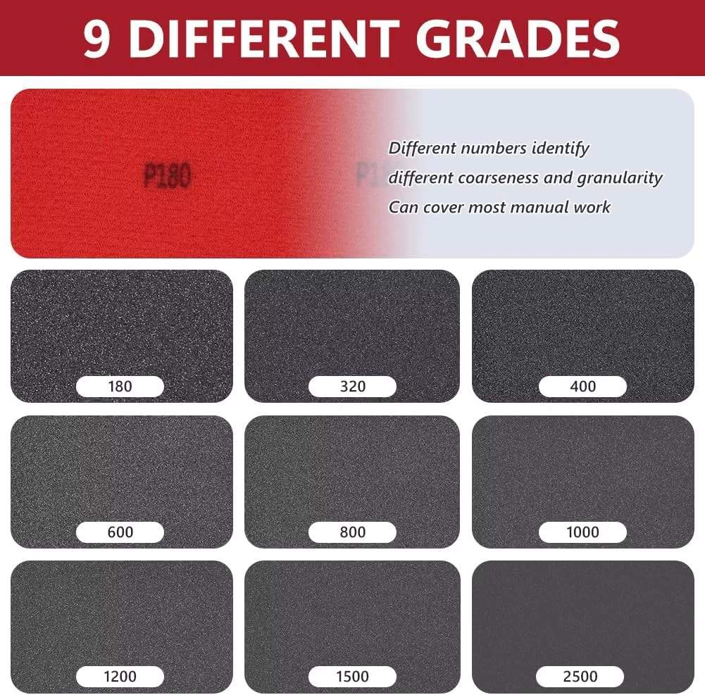 - Teljes készlet 9 különböző szemcsemérettel (180-tól 2500-ig), amely minden csiszolási igényt kielégít.