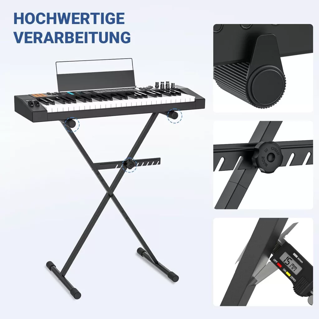 A négy forgó lábvédő és a csúszásmentes gumivédelem garantálja, hogy a billentyűzet biztonságban van, függetlenül attól, hogy otthon gyakorol, tanít vagy élő előadást ad. Az állvány könnyű súlya és kompakt mérete ideálissá teszi az utazó zenészek számára, akik gyakran szállítják felszerelésüket.