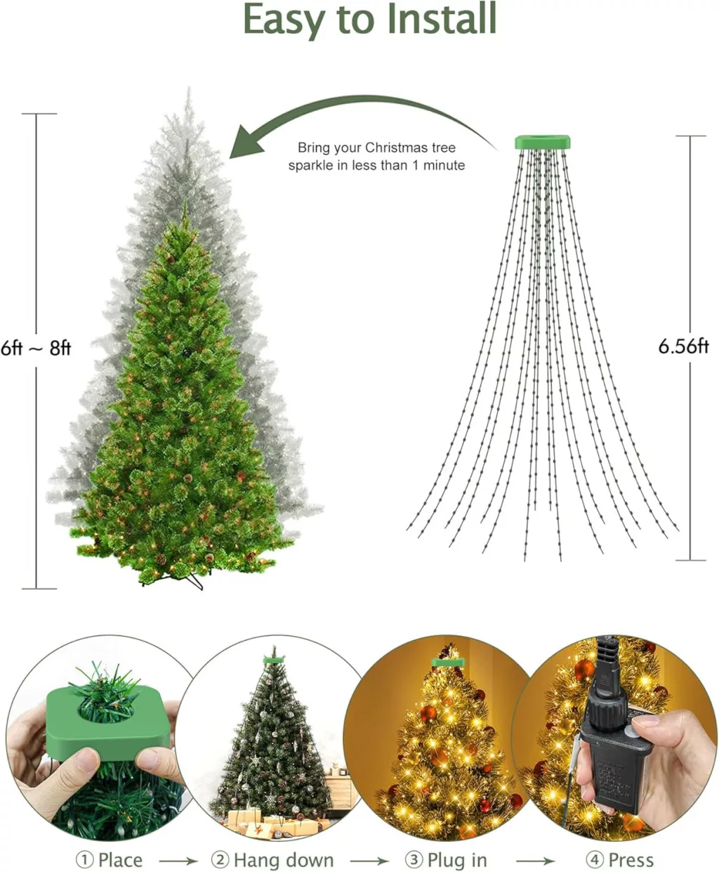 A legjobb eredmény érdekében helyezze a gyűrűt a fa tetejére, majd óvatosan terítse szét a 16 szálat az ágak között. Kezdje a felső részből és haladjon lefelé, biztosítva, hogy a szálak egyenletesen oszlanak el. A 5 méter hosszú tápkábel lehetővé teszi, hogy a csatlakozót a fa mögött vagy egy közeli aljzatban helyezze el. Az időzítő beállításához nyomja meg a kerek gombot a csatlakozón 3 másodpercig, amíg a zöld lámpa fel nem világít. A világítási mód váltásához egyszerűen nyomja meg a gombot röviden.
