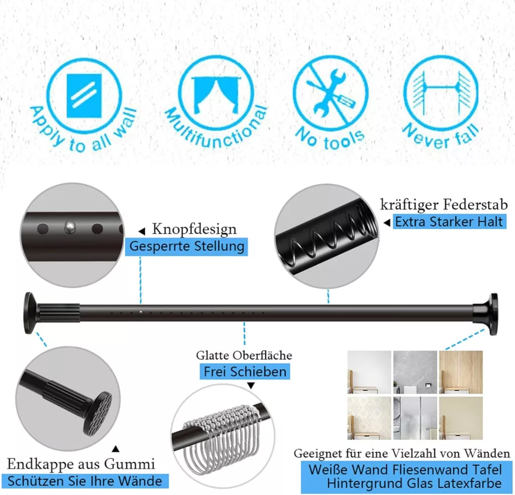 - Sokoldalú felhasználás: Függönytartó, térelválasztó, zuhanyfüggöny-tartó vagy ruhaszárító