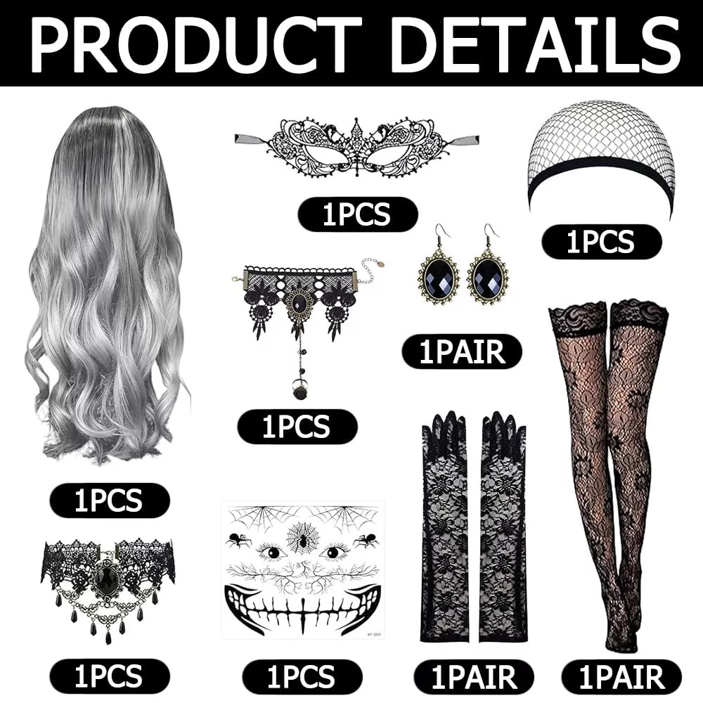 Ez a komplett halloween paróka szett minden szükséges kiegészítőt tartalmaz, hogy tökéletes gótikus megjelenést alakítson ki. A 70 cm hosszú ezüst-szürke paróka szintetikus szálakból készült, hőálló anyagból, amely biztosítja a hosszú viselés kényelmét. A szett tartalmazza az összes szükséges gótikus ékszert, csipke kiegészítőket és dekoratív elemeket, amelyek garantáltan felkeltik a figyelmet bármely halloween partyn, karneválon vagy jelmez eseményen.
