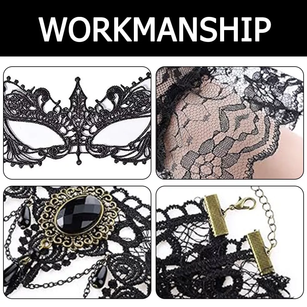 • Gótikus ékszerek: nyaklánc, karkötő, fülbevaló és csipkés maszk