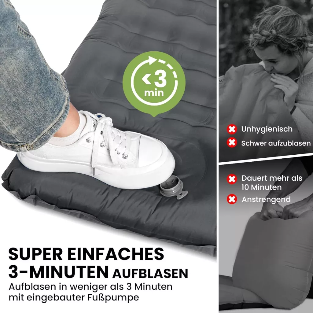 Az integrált lábpumpa és dupla szelepek azt jelentik, hogy nem kell aggódnia a felfújás vagy kiürítés miatt. Mindössze 3 perc alatt kész az alvásra, és az összehajtott méret (18 x 18 x 33 cm) azt jelenti, hogy könnyedén elfér bármely hátizsákban.