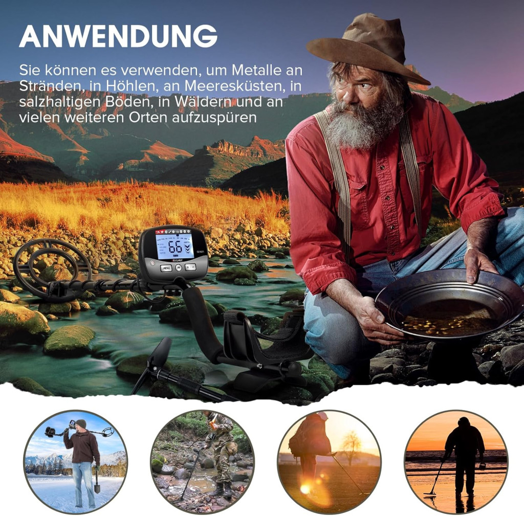 • Aranykeresés – Folyók és patakok partján, valamint homokos területeken hatékony aranydetektálás.