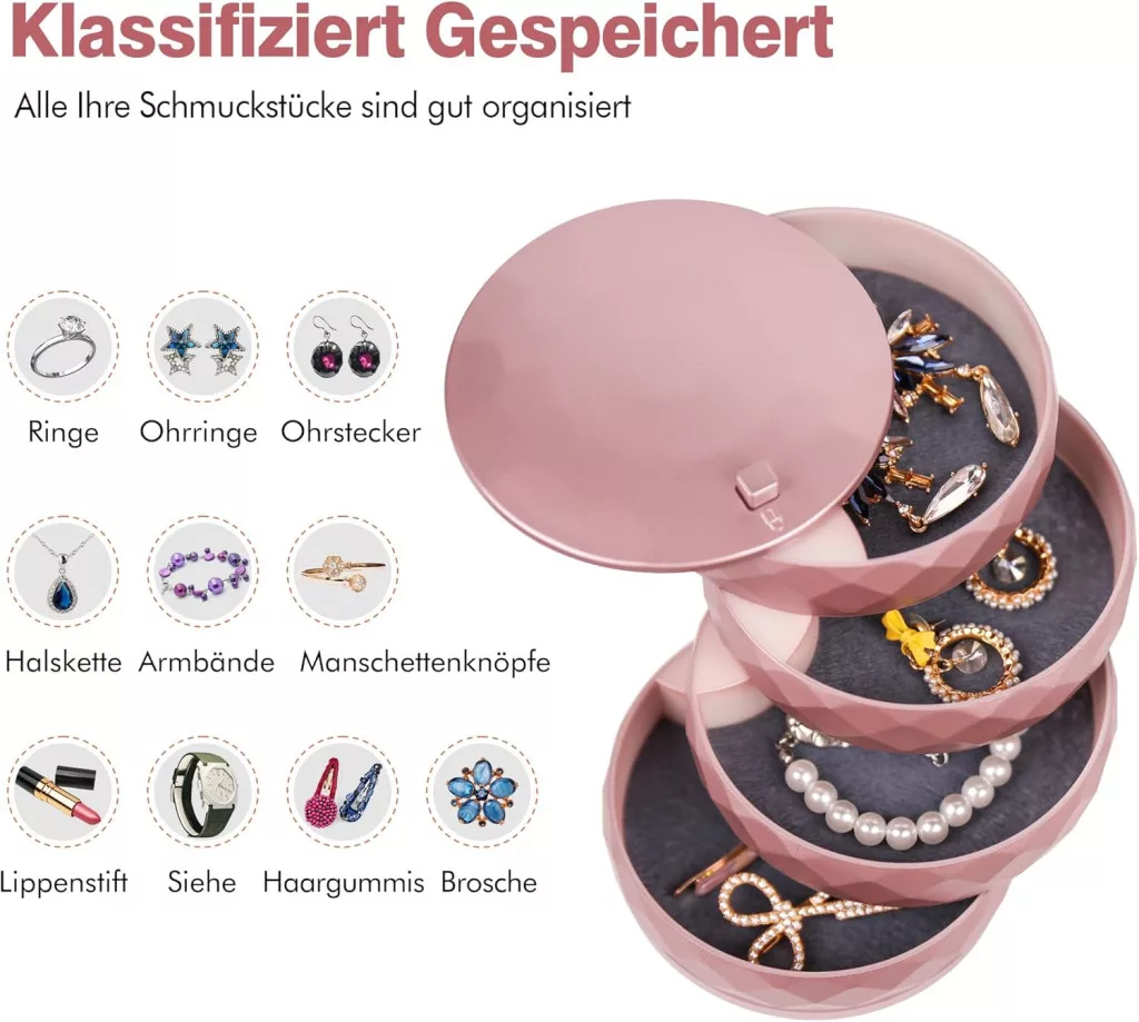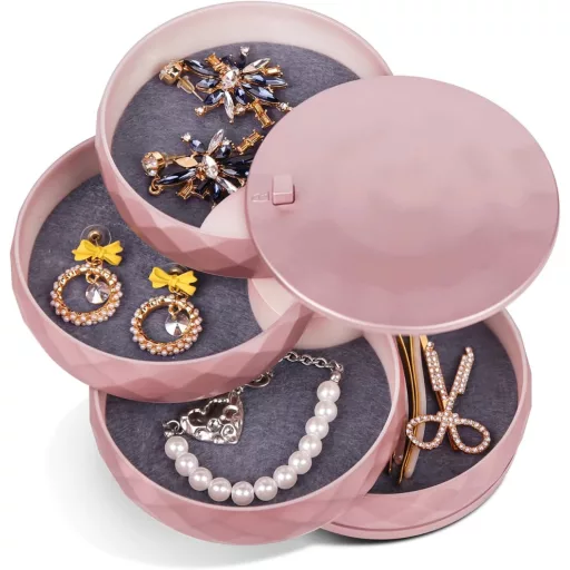 Az INMORVEN ékszertartó doboz a modern stílus és a praktikus funkcionalitás tökéletes kombinációja. Ez az elegáns, rozéarany színű tárolódoboz kifejezetten arra tervezték, hogy rendezetten tartsa összes ékszereit egy helyen. A forgó mechanizmus lehetővé teszi, hogy könnyedén hozzáférjen bármely ékszeréhez anélkül, hogy az egész dobozban keresgélne.