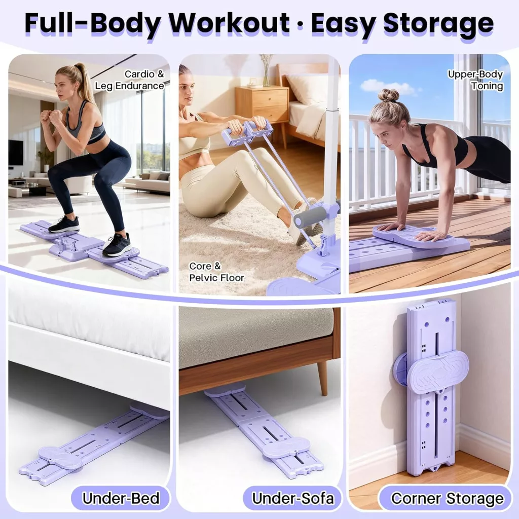 Az egyik legfontosabb előnye ennek az eszköznek a kompakt tárolhatósága. Az összecsukható kialakítás lehetővé teszi, hogy az edzés után mindössze néhány lépésben lapos lemezzé alakítsa az eszközt. Az összecsukott mérete csupán 64 x 34 x 15 cm, amely körülbelül 60%-kal kisebb, mint az összeépített állapot. Könnyen tárolható az ágy alatt, a kanapé mögött, szekrényben vagy a szoba sarkában, így nem foglal el értékes lakóteret.