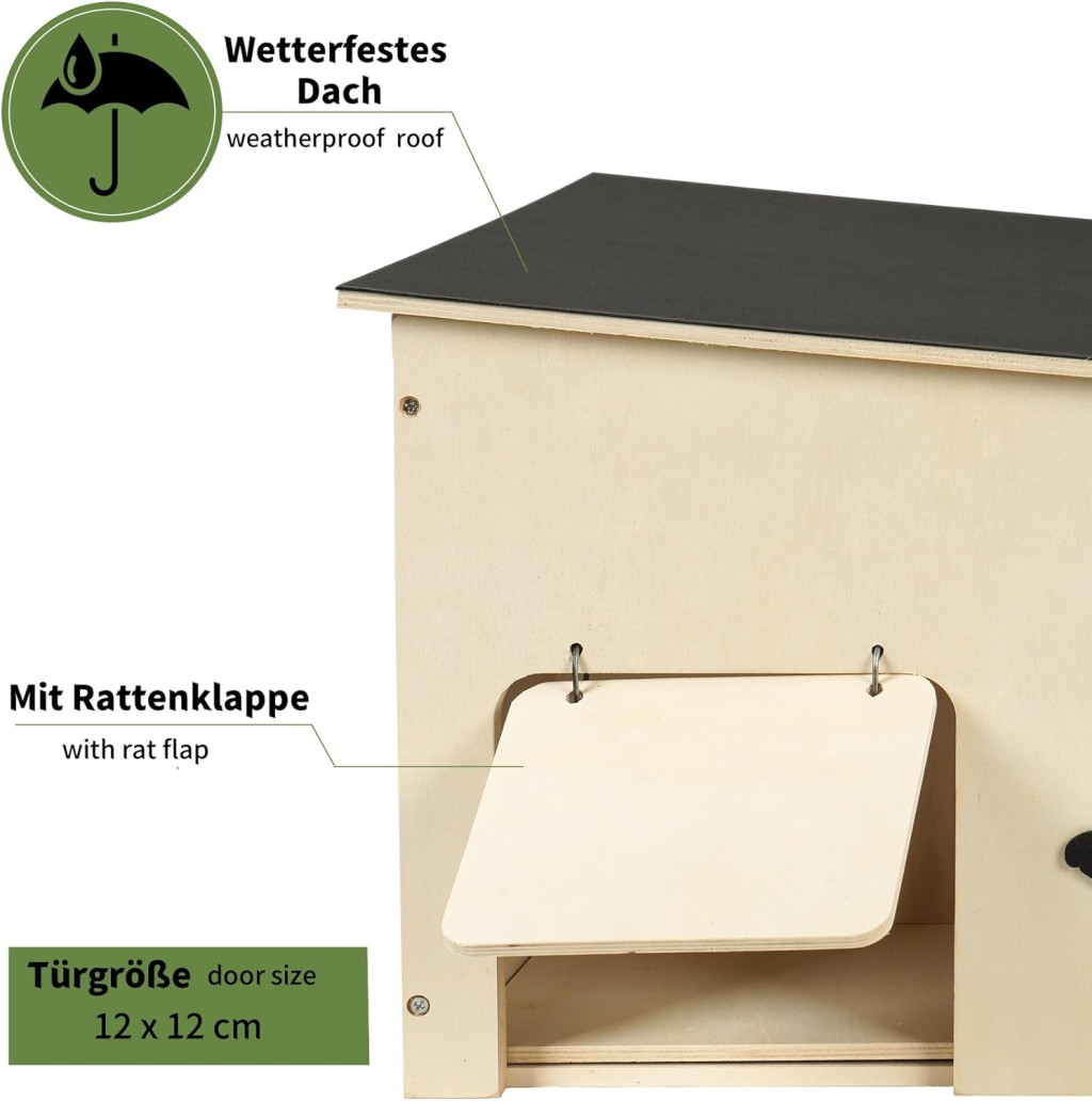 • ???? Vízálló tetőborítás: Távol tartja a nedvességet és biztosítja a száraz, meleg fészket. Az erősebb, tartósabb laminált fa megelőzi a fa vetemedését.