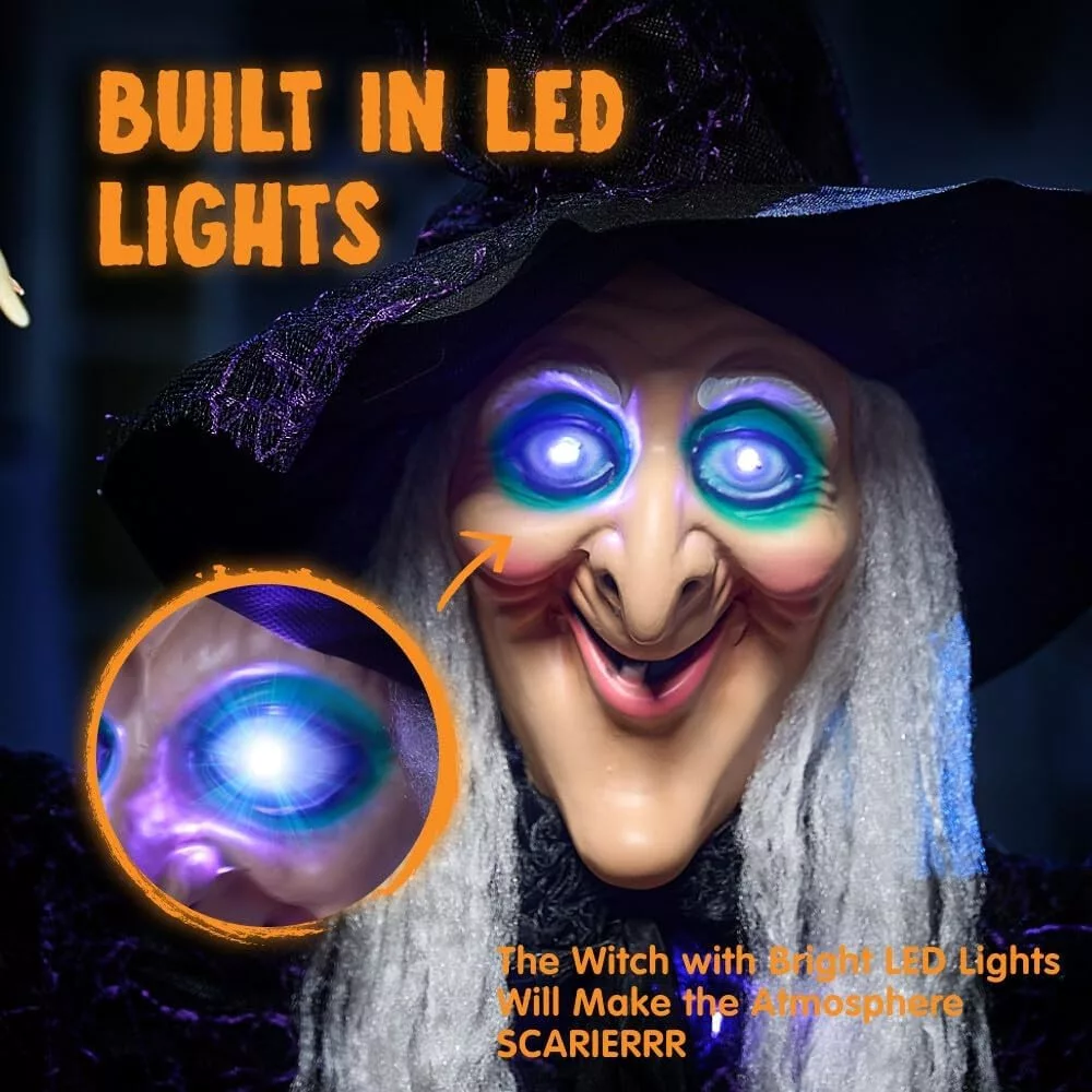 A 72 hüvelyk magas függő animált boszorkány figura a piacon az egyik legjobb választás azok számára, akik valódi Halloween atmoszférát szeretnének teremteni. A termék kombinációja a figyelemfelkeltő méretnek, a világító LED szemeknek és a hangaktivációs funkciónak garantáltan megijeszti a látogatókat.