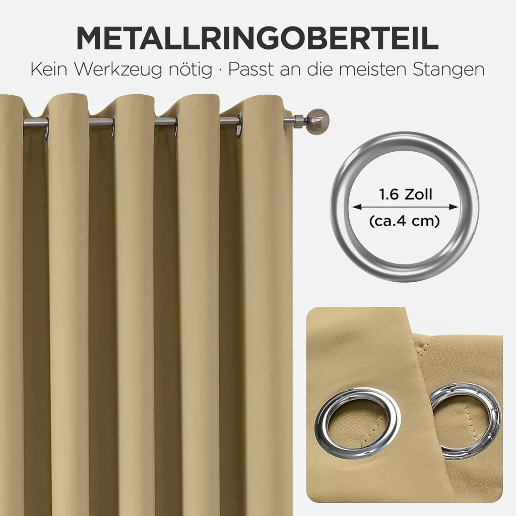 Az 100% poliészter anyag garantálja a hosszú élettartamot és az egyszerű karbantartást. A prémium minőség és az elegáns bézs szín azt jelenti, hogy ez a függöny nem csupán funkcionális, hanem esztétikus is. Az ezüst grommetek professzionális megjelenést adnak, és szinte minden függönyrúdra illeszkednek.