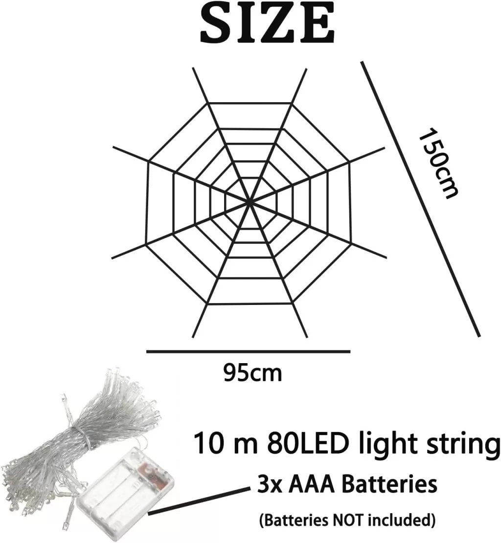 A termék beltéri és kültéri használatra egyaránt alkalmas. Az elemről működő rendszer miatt nem szükséges elektromos csatlakozás, így maximális rugalmasságot biztosít az elhelyezésben. A szintetikus szálból készült pókháló rugalmas és tartós, könnyen formázható bármilyen felületre. A LED-es fényfüzér 10 méter hosszú, amely elegendő a pókháló teljes lefedéséhez vagy akár további dekorációs elemek megvilágításához. Az elemcsere egyszerű és gyors, így a dekoráció hosszú ideig használható marad.