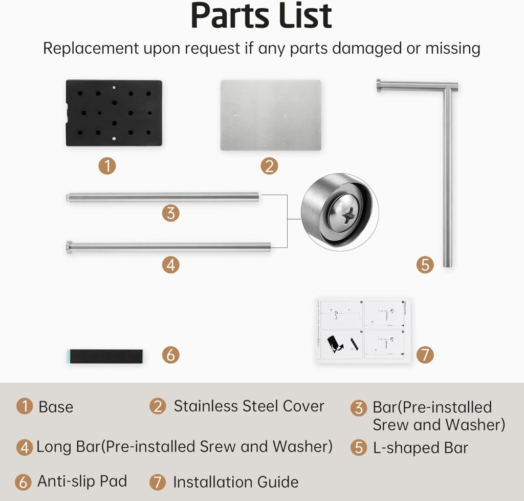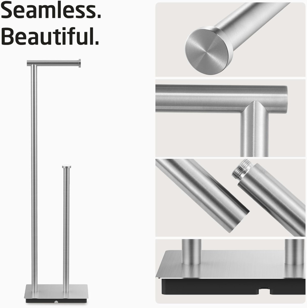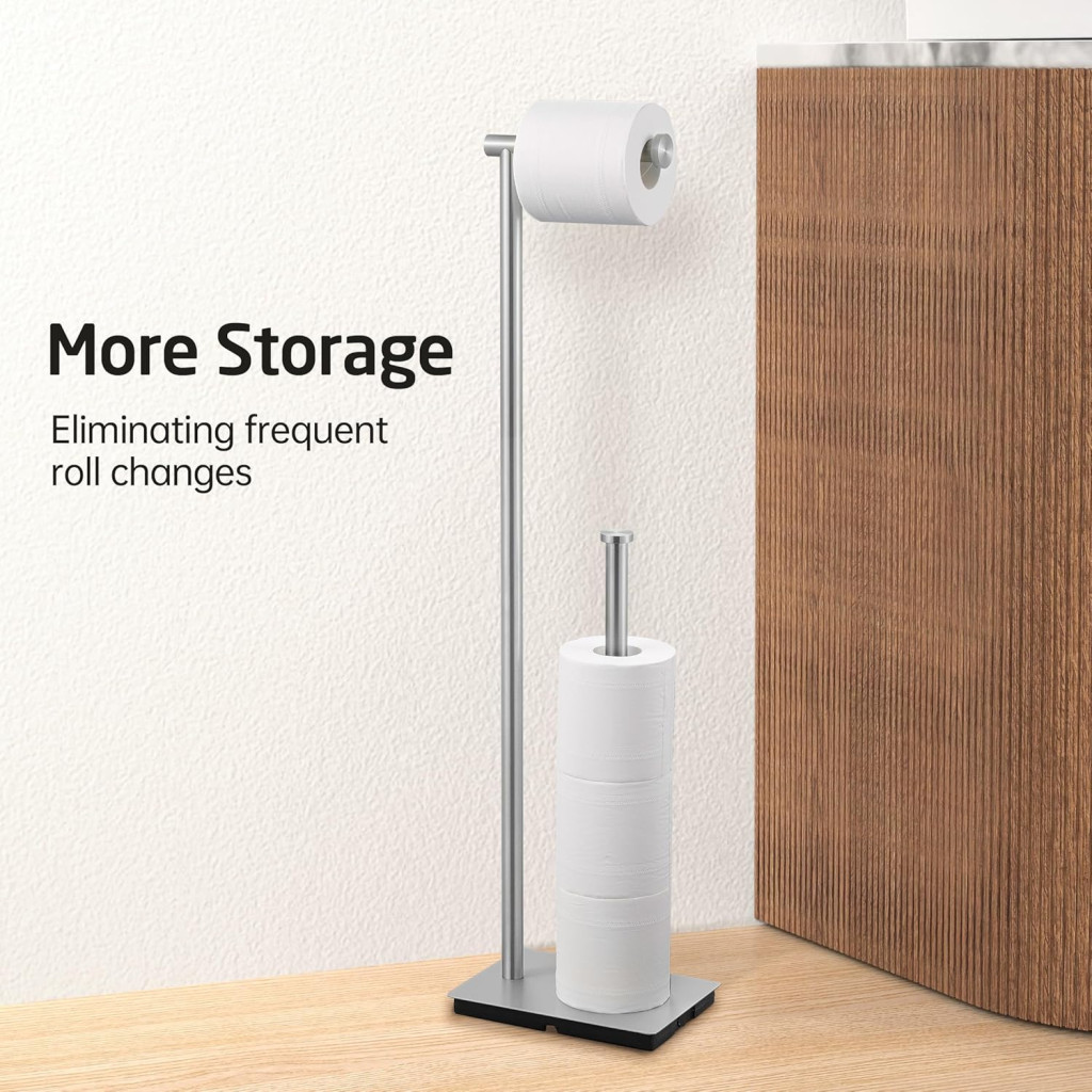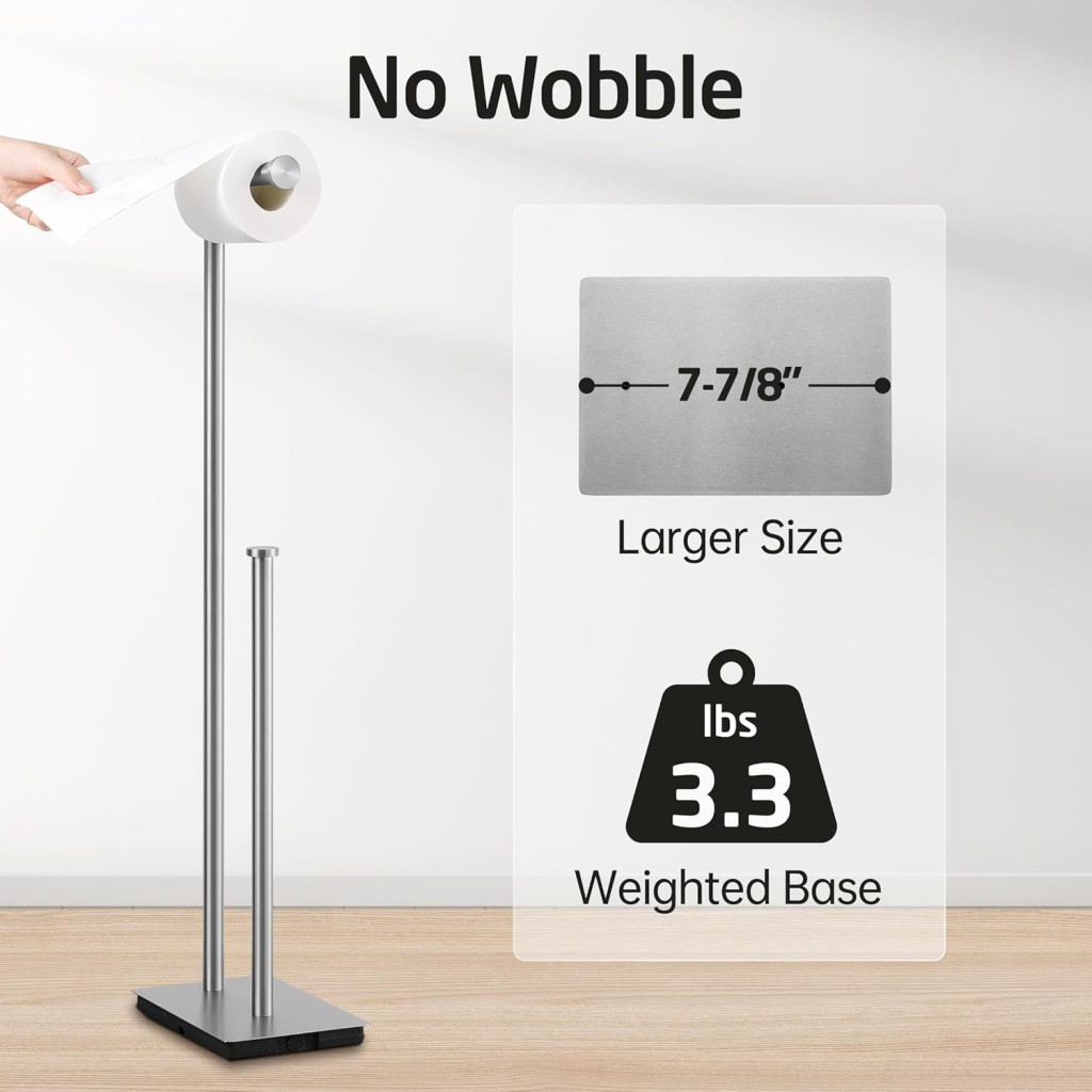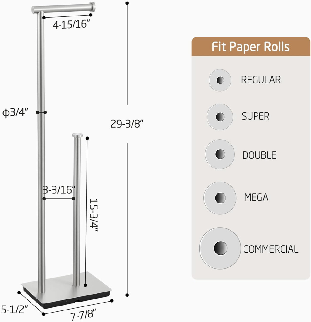 Az 5 hüvelykes (12,7 cm) roller kar hossza biztosítja, hogy a papír tekercs biztonságosan rögzítve legyen, míg a roller kar sapka további védelmet nyújt a tekercs lecsúszása ellen. A tartó 75 cm-es magassága ideális a legtöbb fürdőszobai elrendezéshez, és nem foglal el túl sok helyet.