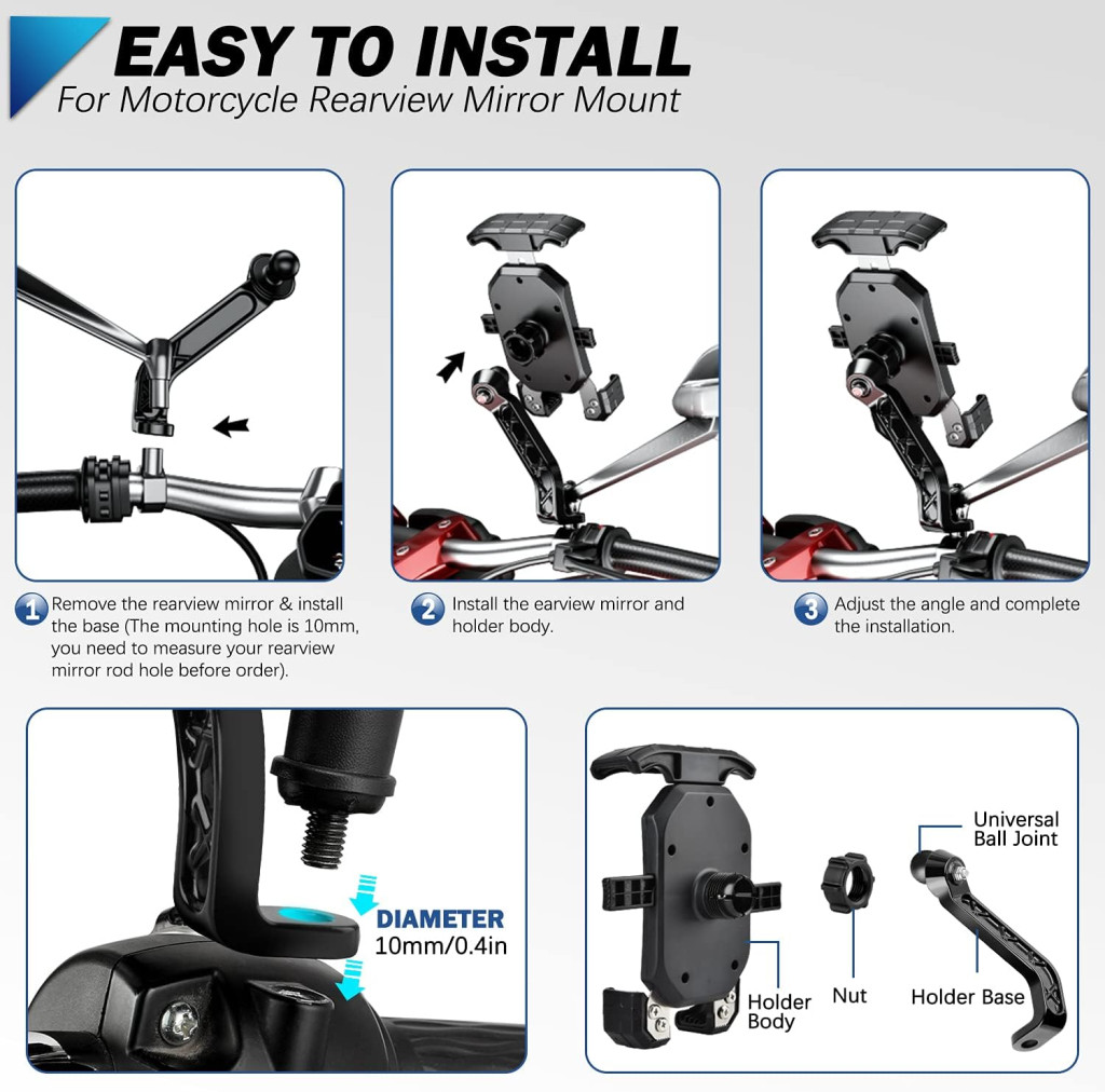 Fontos: A tartó 10 mm-es szerelési furattal rendelkező motoros tükörre szerelhető. Kérjük, mérje meg a tükör szerelési furatának átmérőjét a vásárlás előtt.