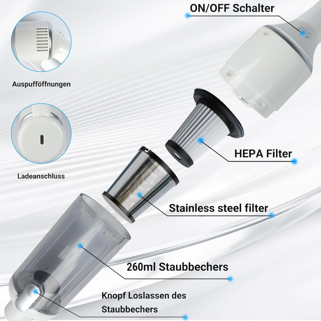 KeautFair Vezeték Nélküli Kézi Porszívó 120W/15000Pa - Kompakt Újratölthető Mini Porszívó Mosható HEPA Szűrőkkel Nedves-Száraz Használatra,