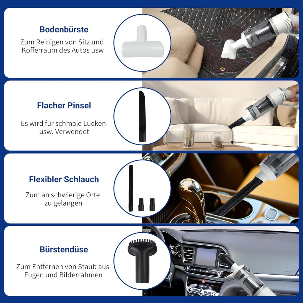 • Autótisztítás: A vezeték nélküli kialakítás és a különböző fejek ideálissá teszik az autó belső terének tisztítására, beleértve az ülések közötti réseket, padlószőnyeget és műszerfalat.