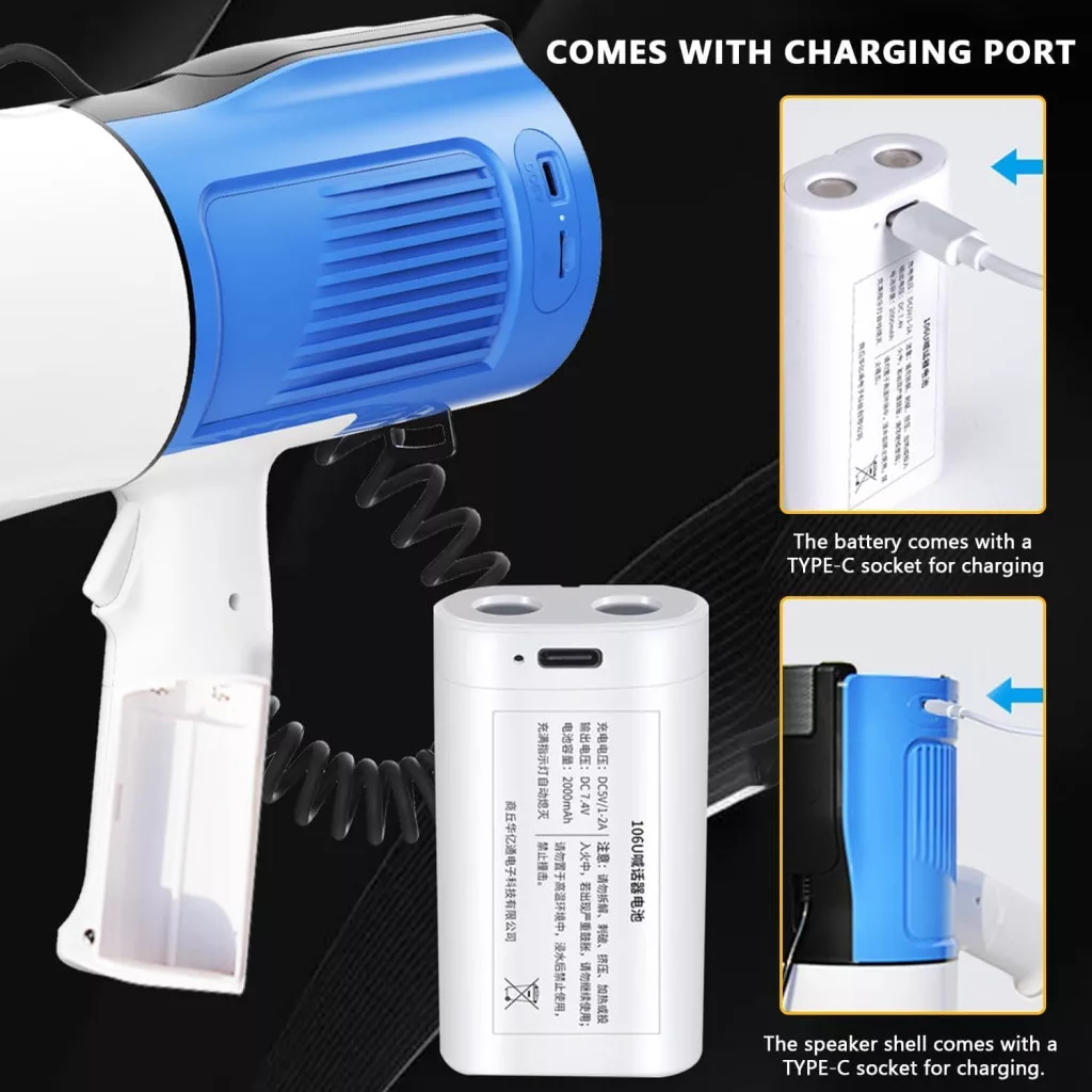A Kensbro megafon rugalmas töltési megoldásokkal rendelkezik, amely biztosítja a hosszú üzemidőt és a kényelmes használatot. Az eszköz cserélhető akkumulátorral van felszerelve, amely lehetővé teszi a gyors és kényelmes csere közvetlenül az eszközön. Ezenkívül támogatja a beépített töltést is, amely azt jelenti, hogy az akkumulátort nem kell eltávolítani a töltéshez. Ez a kettős töltési lehetőség biztosítja, hogy mindig készen áll az eszköz a használatra, és nem kell aggódnia az akkumulátor lemerülése miatt hosszabb rendezvények során.